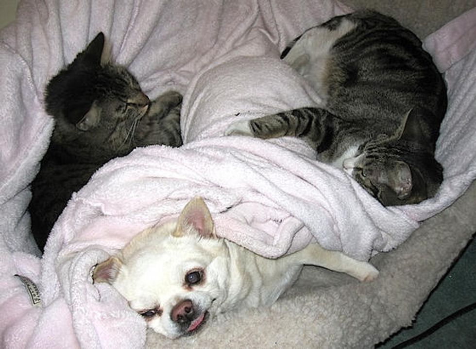 Here she's cuddling with her mama Chula and snuggling with Dante the cat (another rescued that Chula adopted)