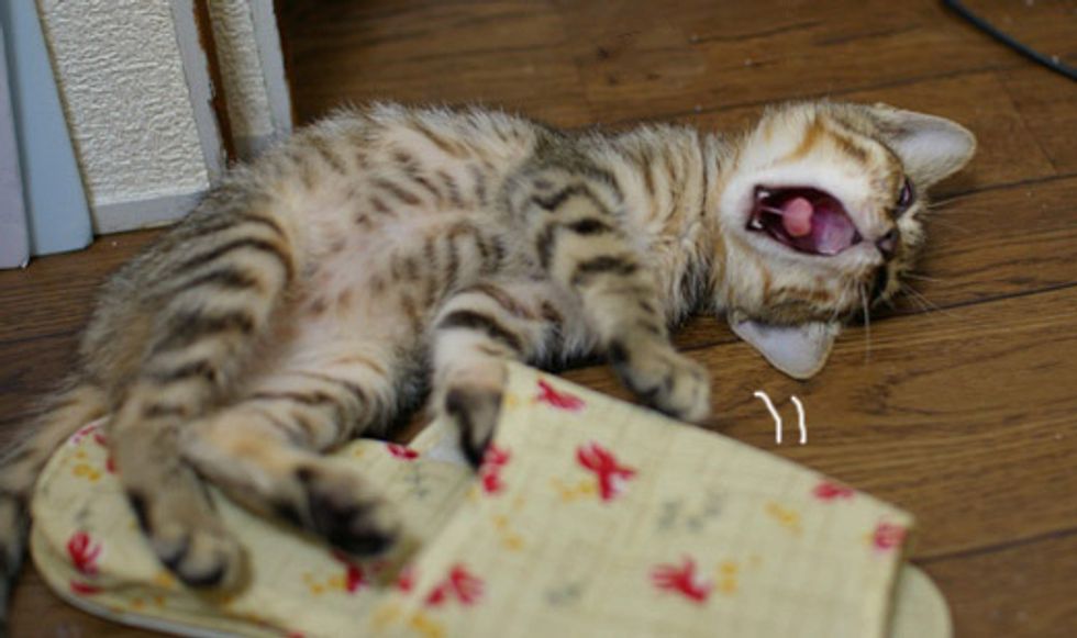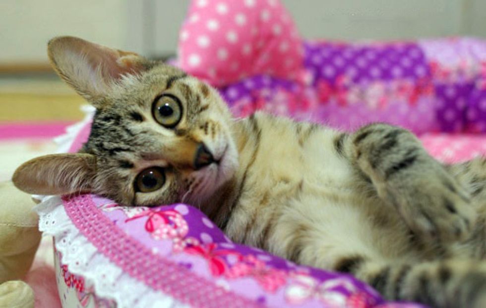A little abandoned tiger kitten with only skin and bones was found crouching in the grass beside the roads one day. She was dirty, tired and hungry. When she was found, she started her tiny little cries as if she was asking for help. 10 minutes later, the little cold ridden kitten found her way to a new foster home.