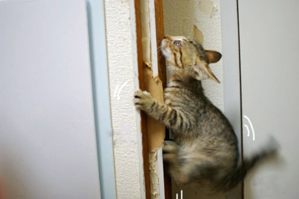 She was named Choko which means Chocolate in Japanese for the color of her coat. Right before her arrival, two other kittens were also rescued and put into isolation room. They had to share the room together, but a fence was set up, so they would not have any contact until their medical was clear.