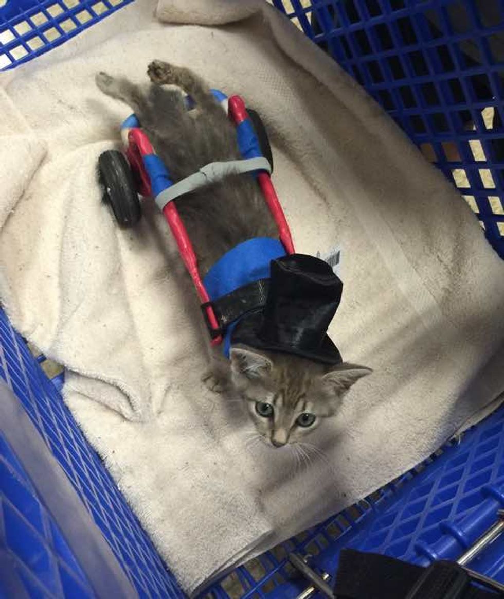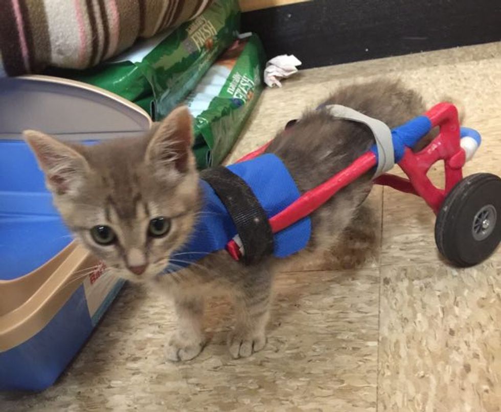 "His foster mom keeps making bigger carts for him as he grows and he gets around well... His chair gets adjusted to help him use his muscles so they don't atrophy. His prognosis is great other than all that and he's in good health, just will be a two legged kitty one day!"