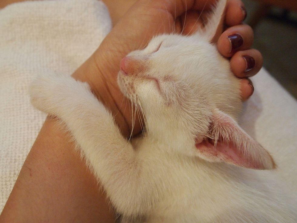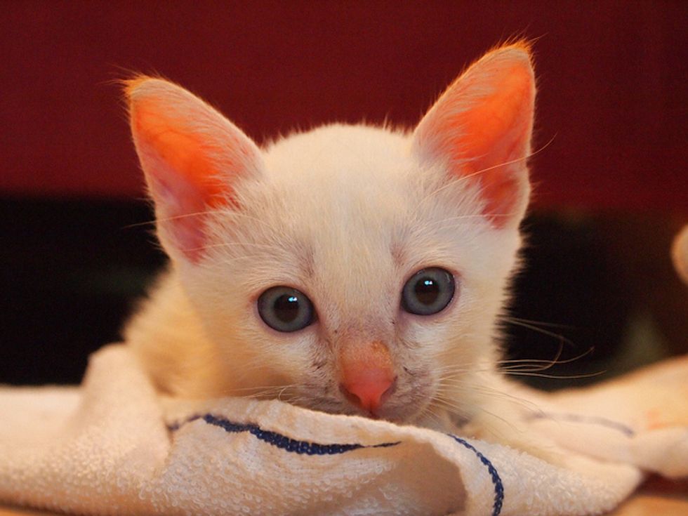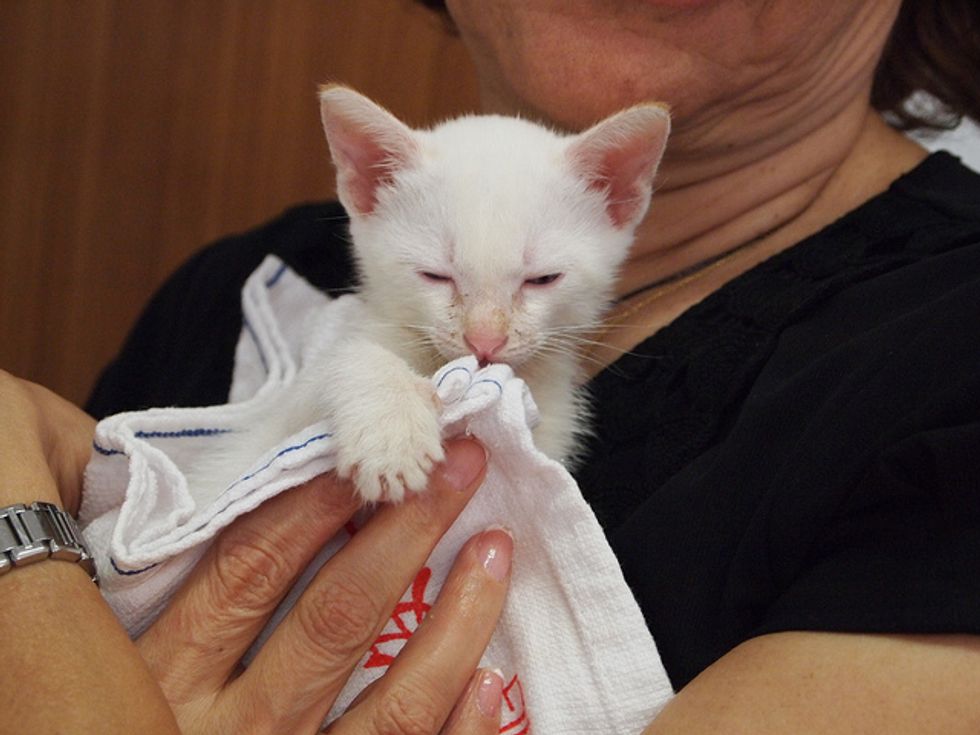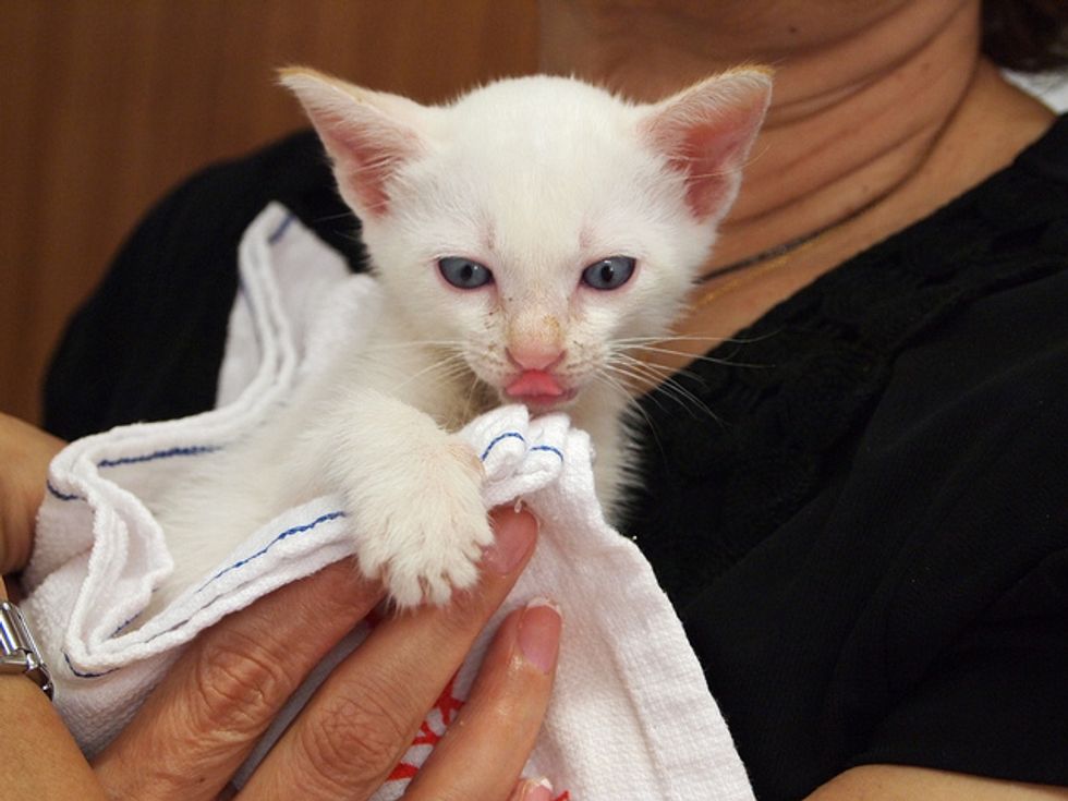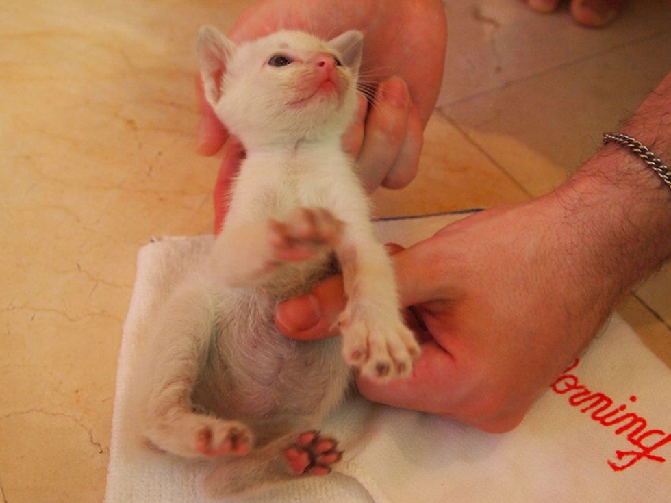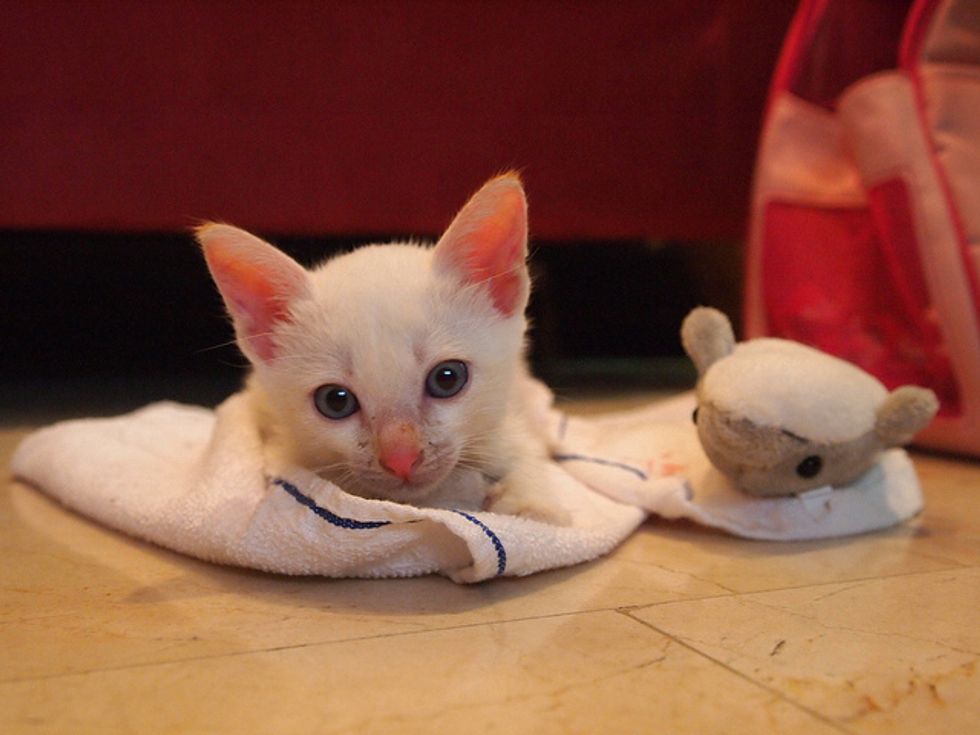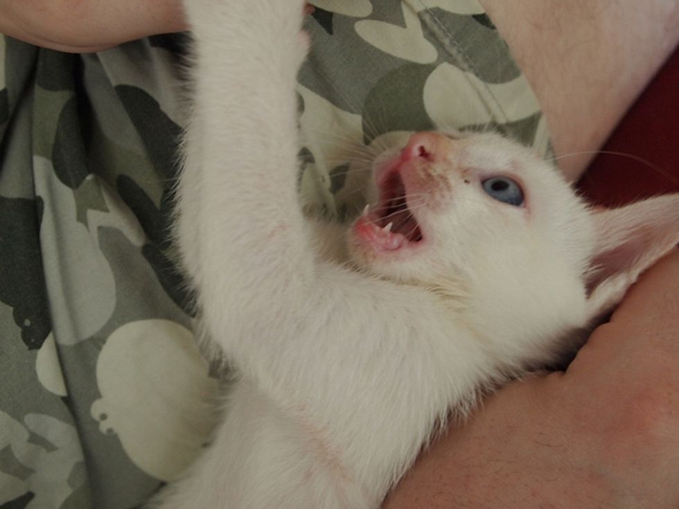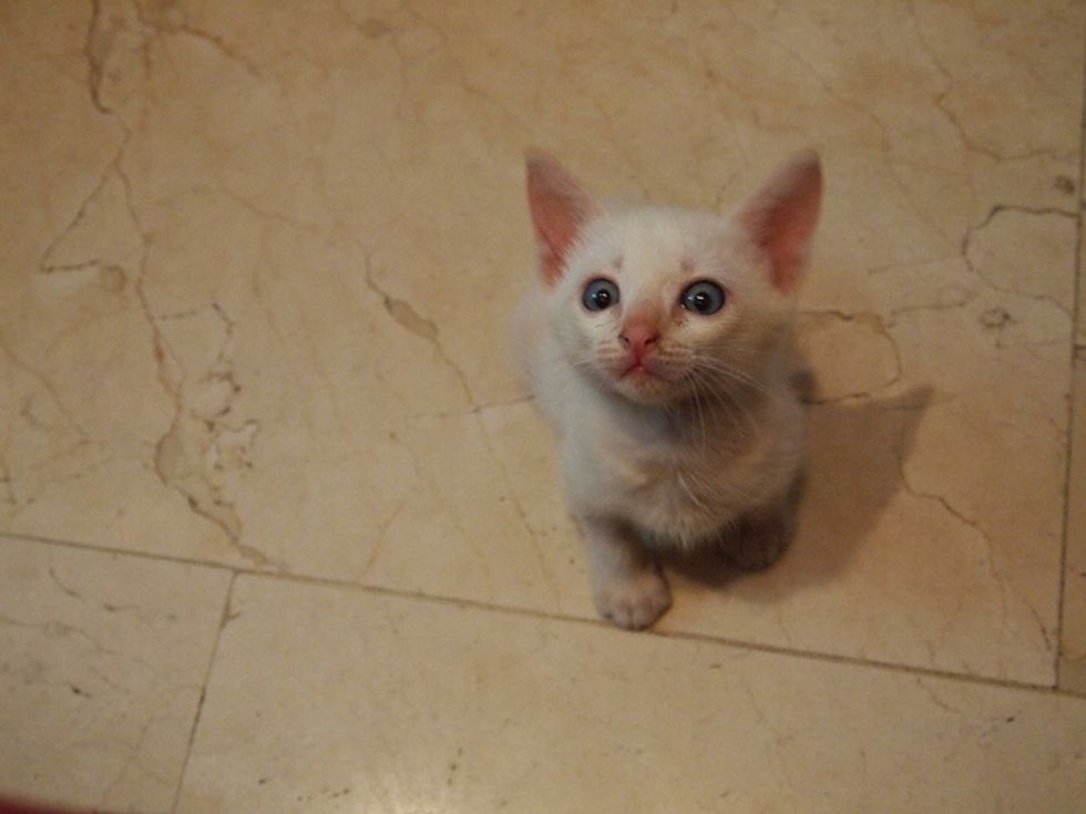 One of my students spotted a white little kitten while she was driving in Singapore on September 1, 2010. She was only four weeks old. My student picked her up and brought her to school. She has five dogs who were not so friendly to the little new comer so she was not able to keep Coco. We put up a notice in school - asking if anyone would adopt her.
