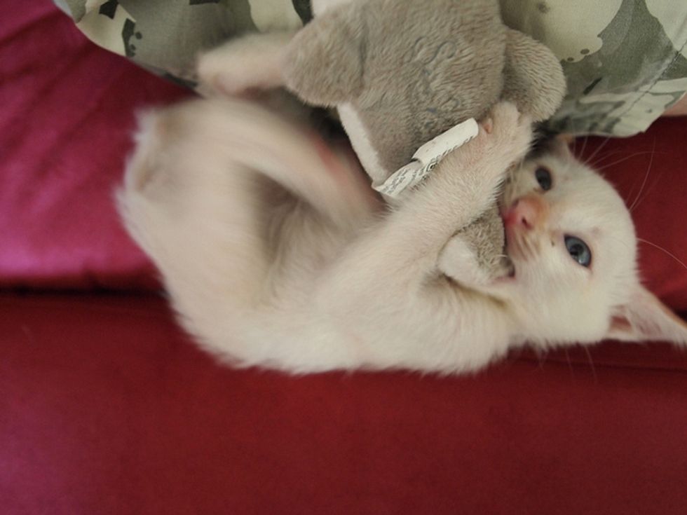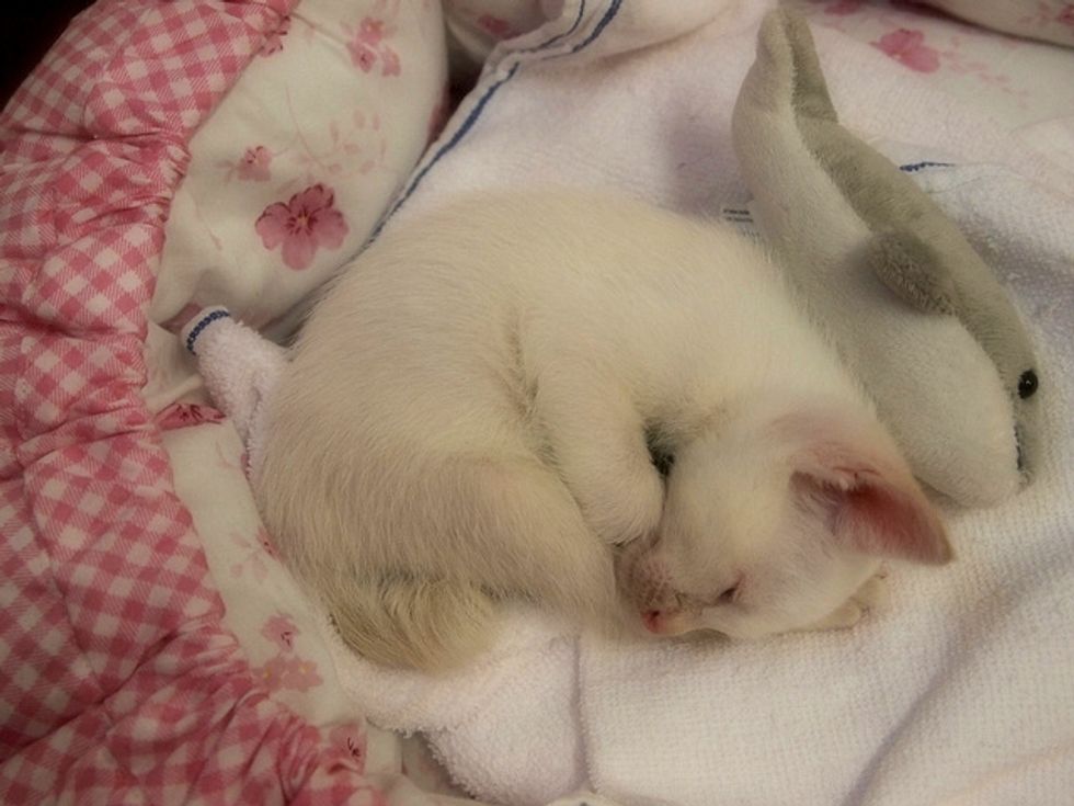 I never had any pets in my entire life... but I fell in love with Coco's white fur and gentle blue eyes. So I decided to foster her until we find someone who genuinely loves her and wants to adopt her. It was difficult at the beginning as she was very skinny and needed a lot of attention. Thanks to my cat-loving work environment, I was allowed to bring Coco to work everyday (even till today!) so I could watch over her and feed her around the clock. Everyone in the office LOVES her! My colleagues in Singapore and New York bought her a bed, a pink carrier, toys, etc - she was so spoilt!