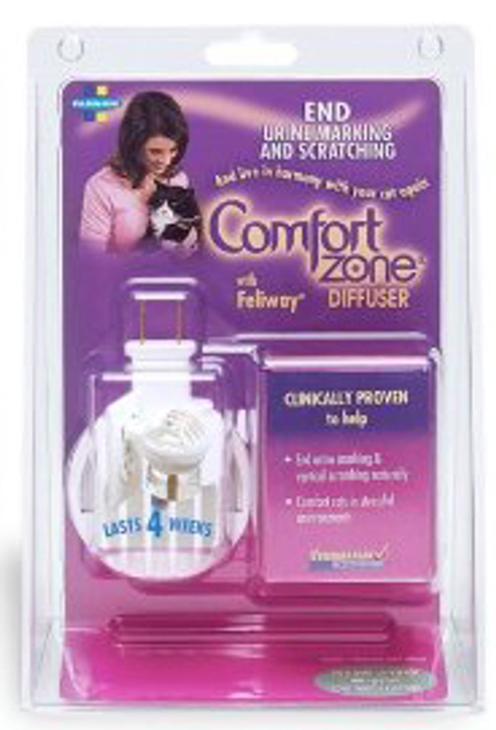 Feliway Comfort Zone Spray or Feliway Comfort Zone Plug-in Diffuser helps calm the cats and assure them that the home they are staying in is secure and the people around them are of no threat. How does the product work? Cats don't spray at the same area that is