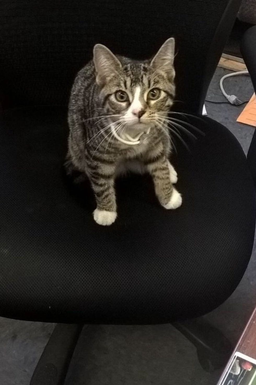 Everyone from the office pitched in to help--they got the kitty food, treats and took him to the vet to get him shots, neutered and chipped.