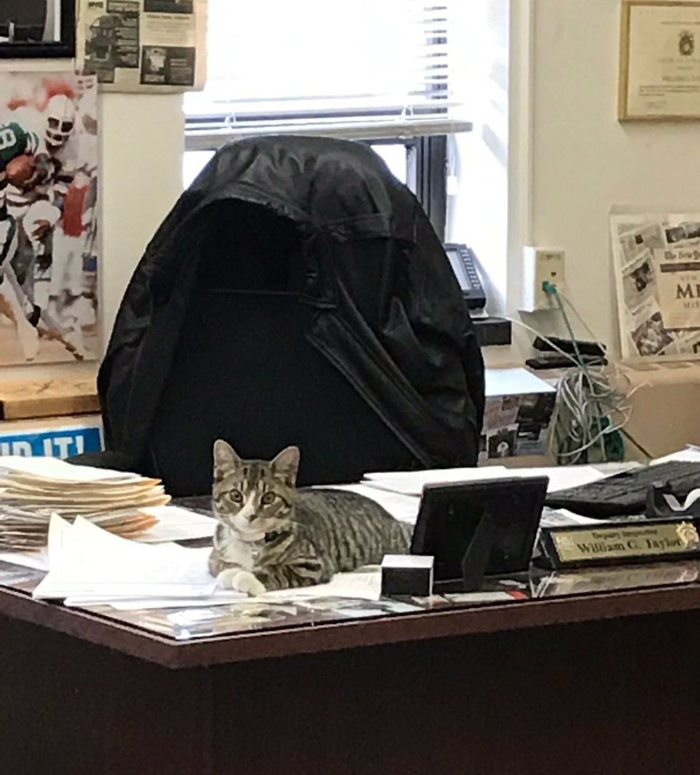 They set up three food stations for their feline supervisor and several baskets for napping and all you can play cat toys. Martin has free reign of the house, but he prefers Taylor's office. Every morning he waits by the door to greet him and then proceeds to take over his chair.