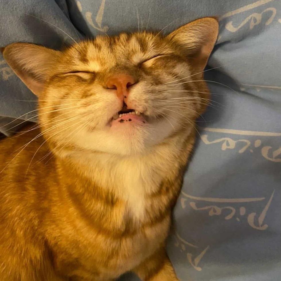 The tabby makes himself very comfortable and knows his way around the couple's abode. He enjoys lounging on the couch or the bed, giving himself a long grooming session before snoozing away with his people close by.