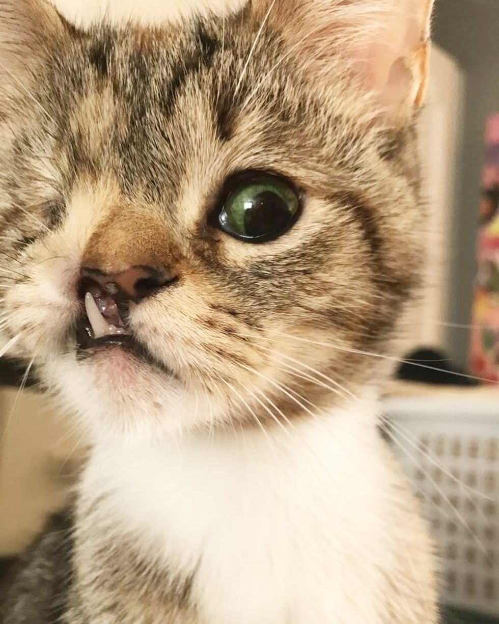 As P grew bigger, her snaggletooth became more prominent. It only added more cuteness to the sweet one-eyed kitty.