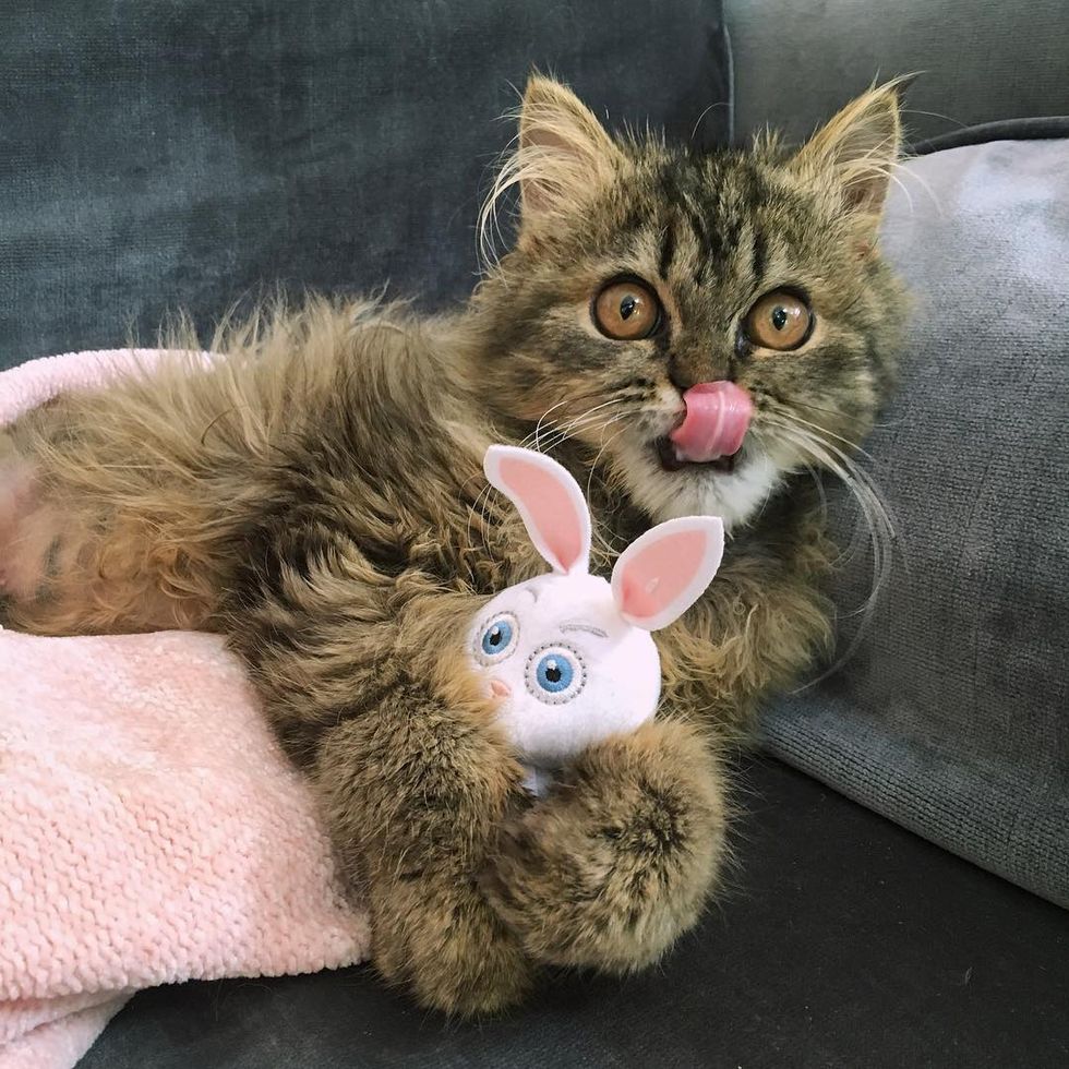 They gave him a little bunny toy to cuddle with, and he loved it and purred up a storm.