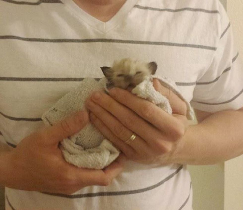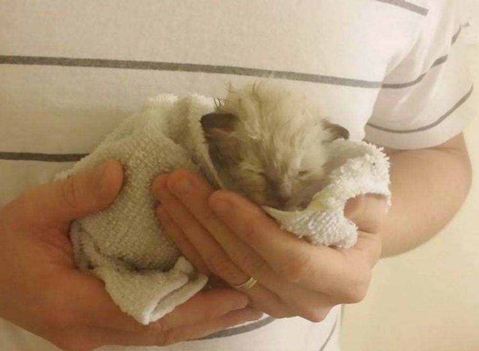 After drying the kitten with a few towels, they cradled him in a soft blanket and brought him outside to show the mama cat that her baby was ok and taken care of.