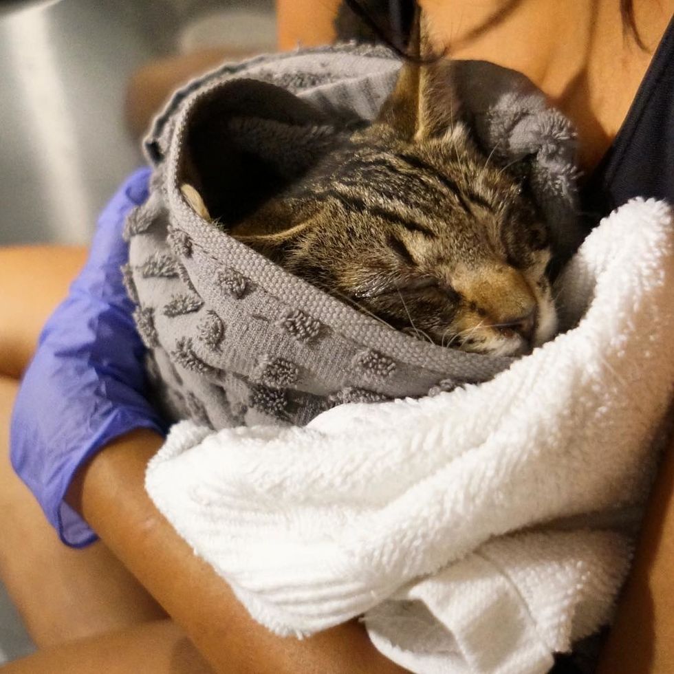 After getting the kitten to safety, he went back for her brother, Fetty, whose eyes were crusted shut. While trying to get Fetty, his bonded sister Storm came along.