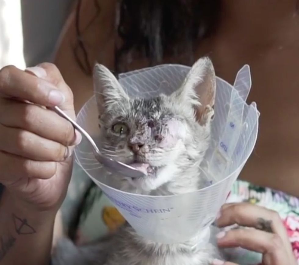 Soon after the surgery, Mani was purring and lapping up baby food, KMR and kitten paté.