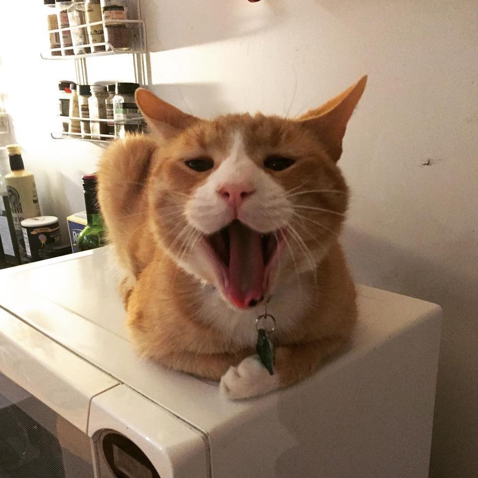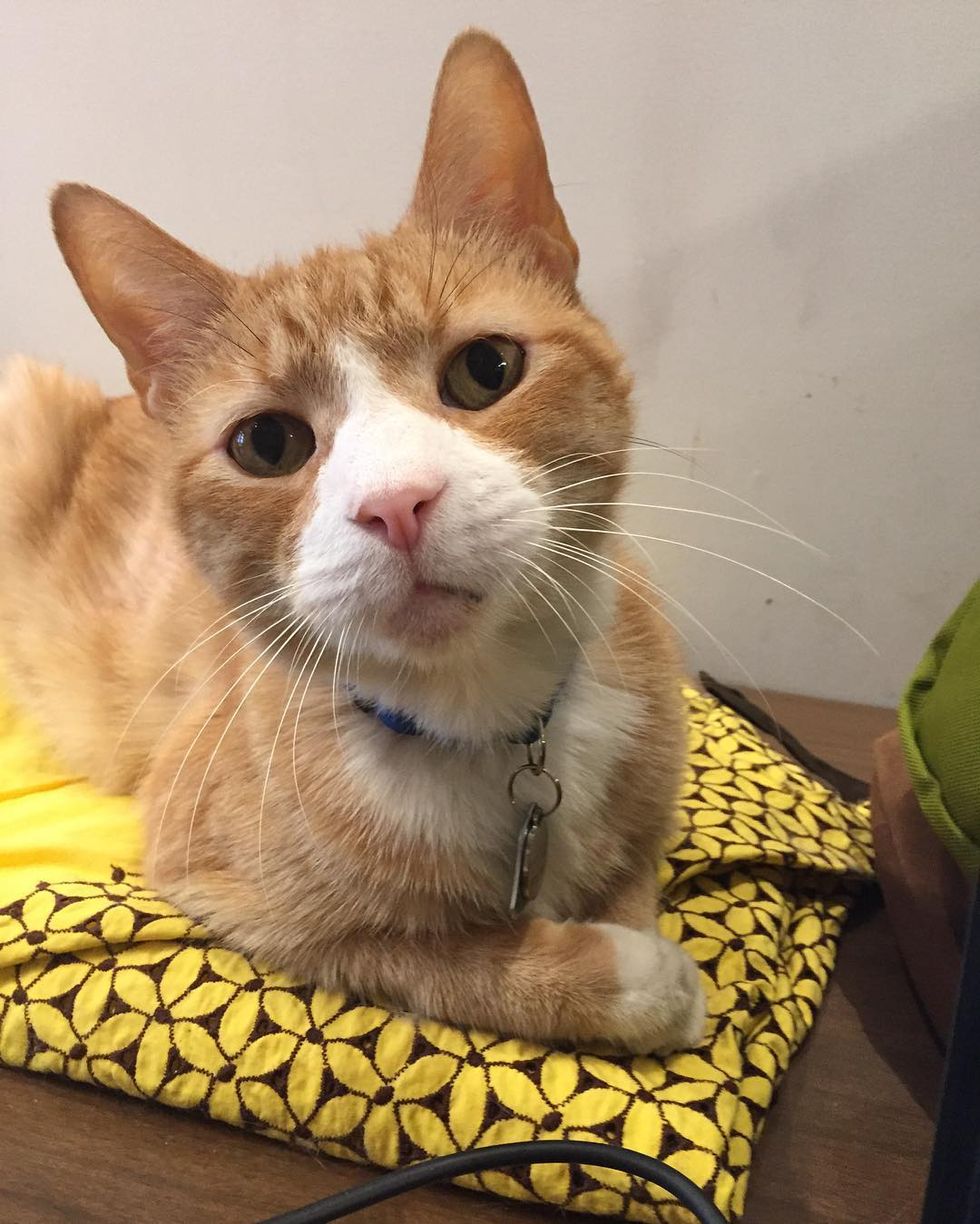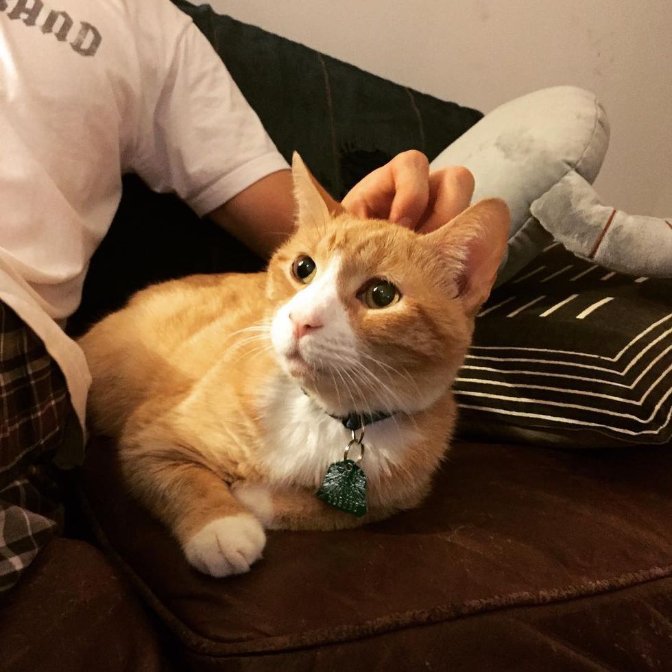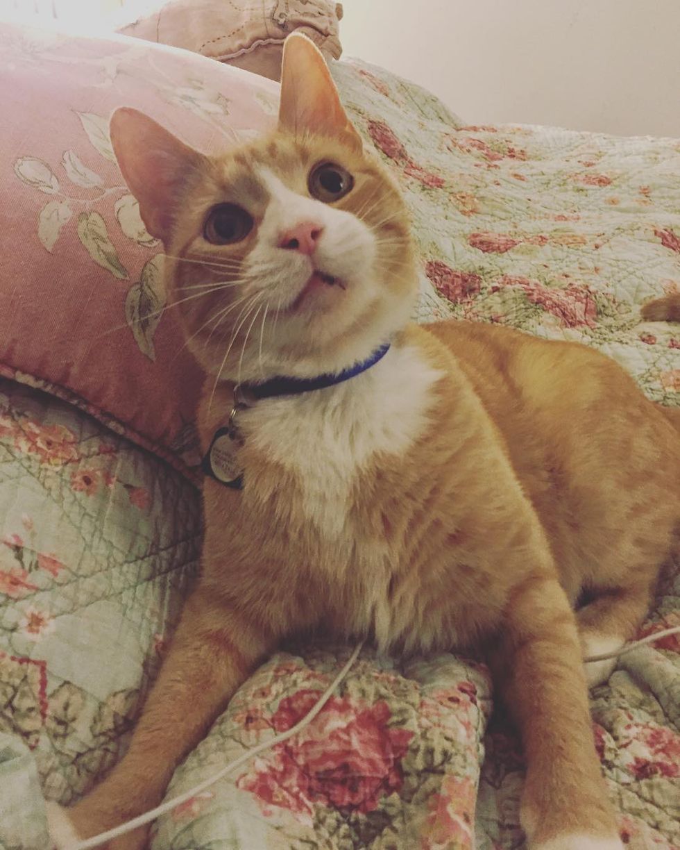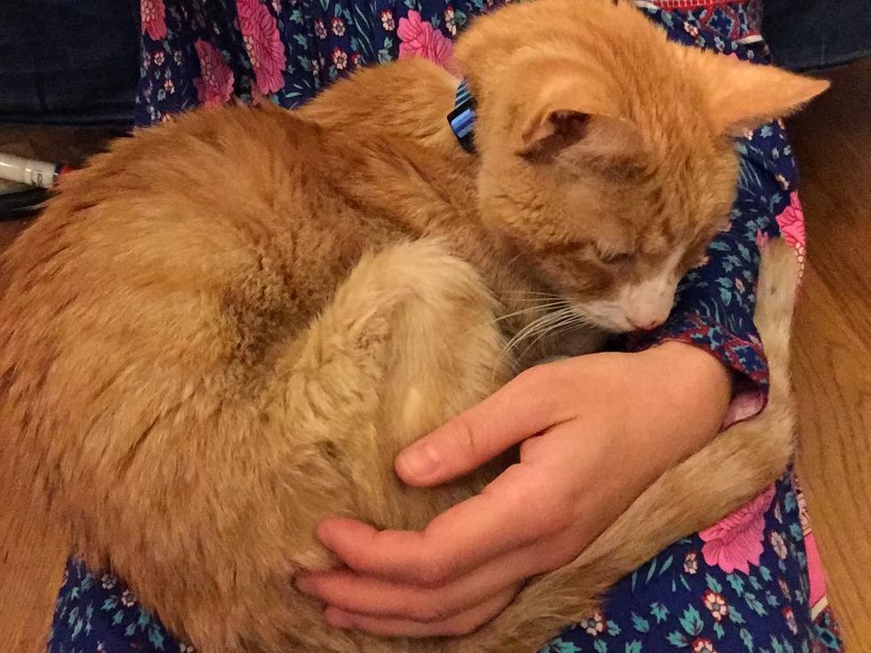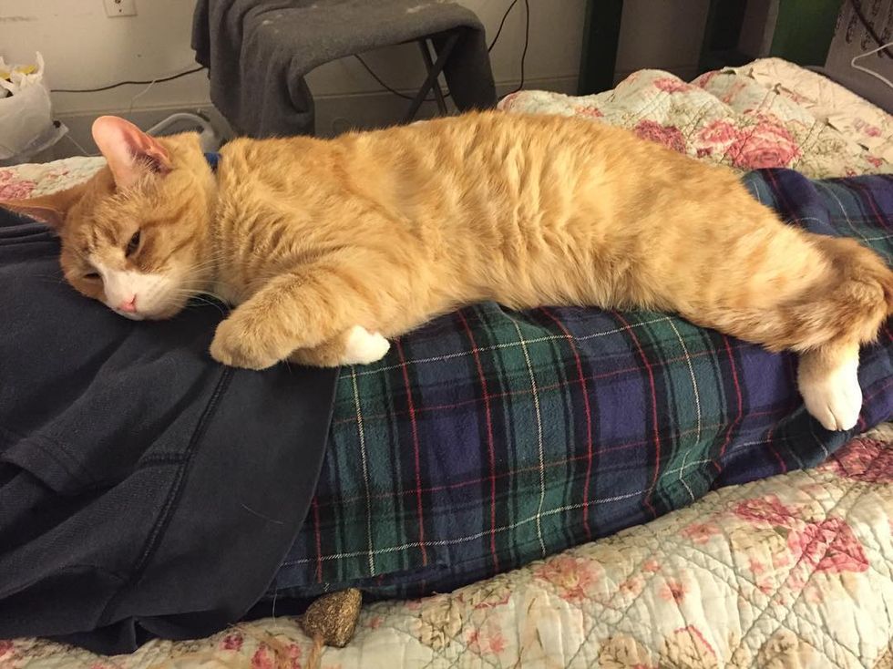"When we first got JJ, he was extremely frail so he did a lot of curling up in bed and slept/ate most of the day. He would also purr non stop as a coping mechanism."
