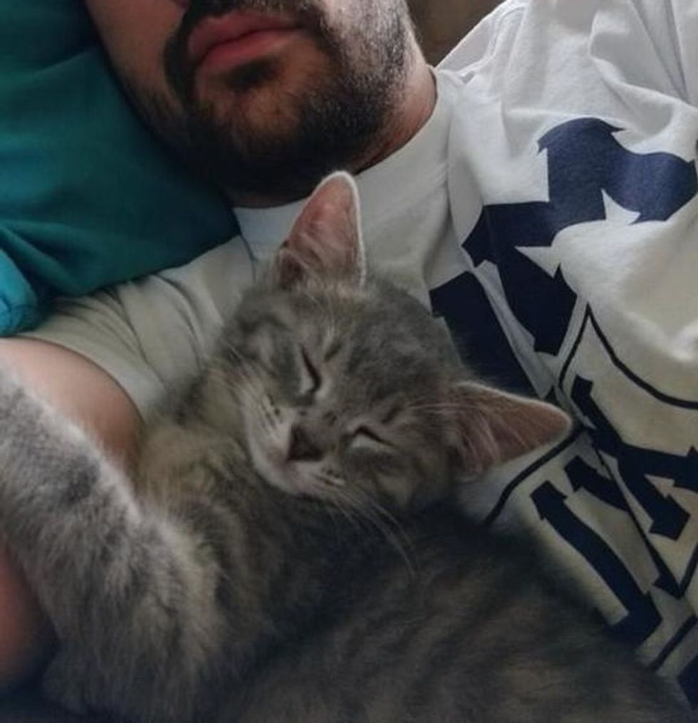 This little guy decided to nap on his human dad's shoulder after a big meal.
