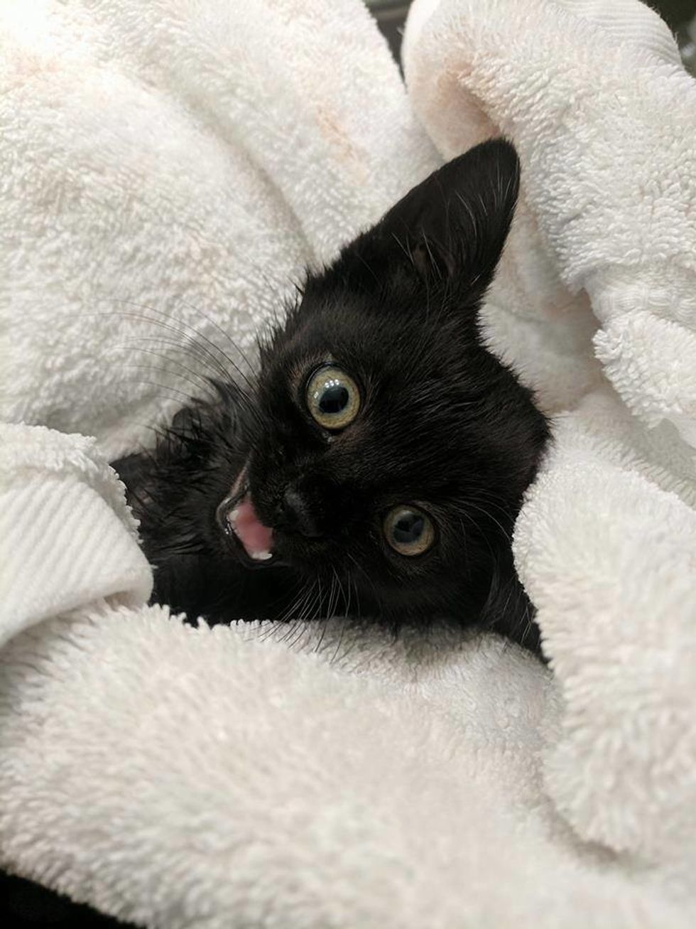 The kitten was skin and bones, covered in fleas and severely dehydrated. Jacqueline and her vet started working on rehydrating the kitten with fluids, washing off the fleas and getting her fed. She weighed just one pound at eight weeks old.