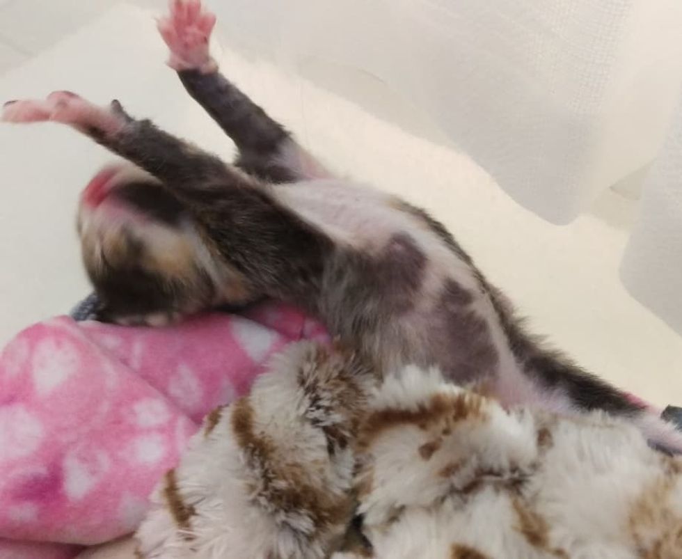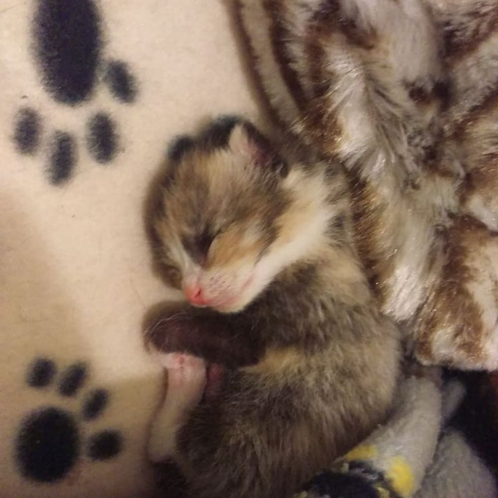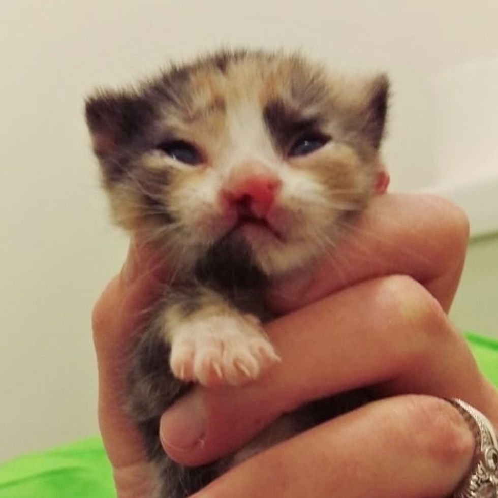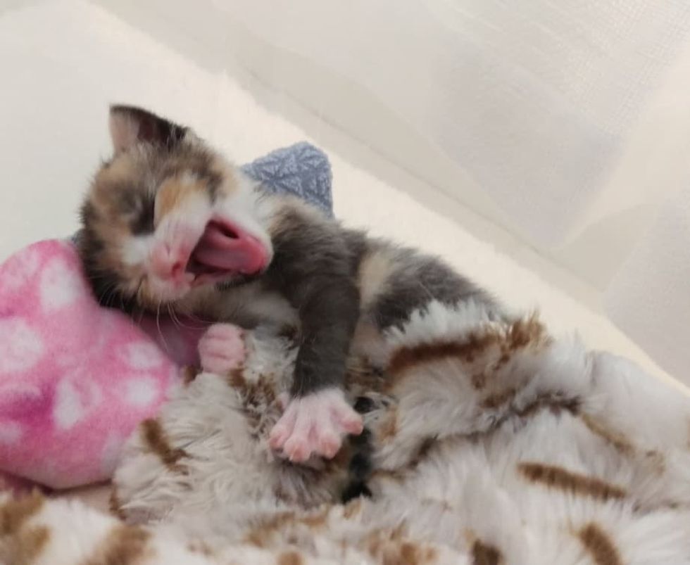 An 11-day old kitten came to her foster home, hoping someone could help her eat. The tiny calico was born with a cleft lip and palate which made it difficult for her to latch on her mother or a bottle.
