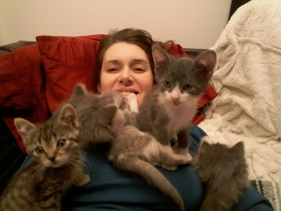 Three weeks after they were found, the kittens are thriving and socializing extremely well. They now demand cuddles and refuse to let their foster mom out of their sight.