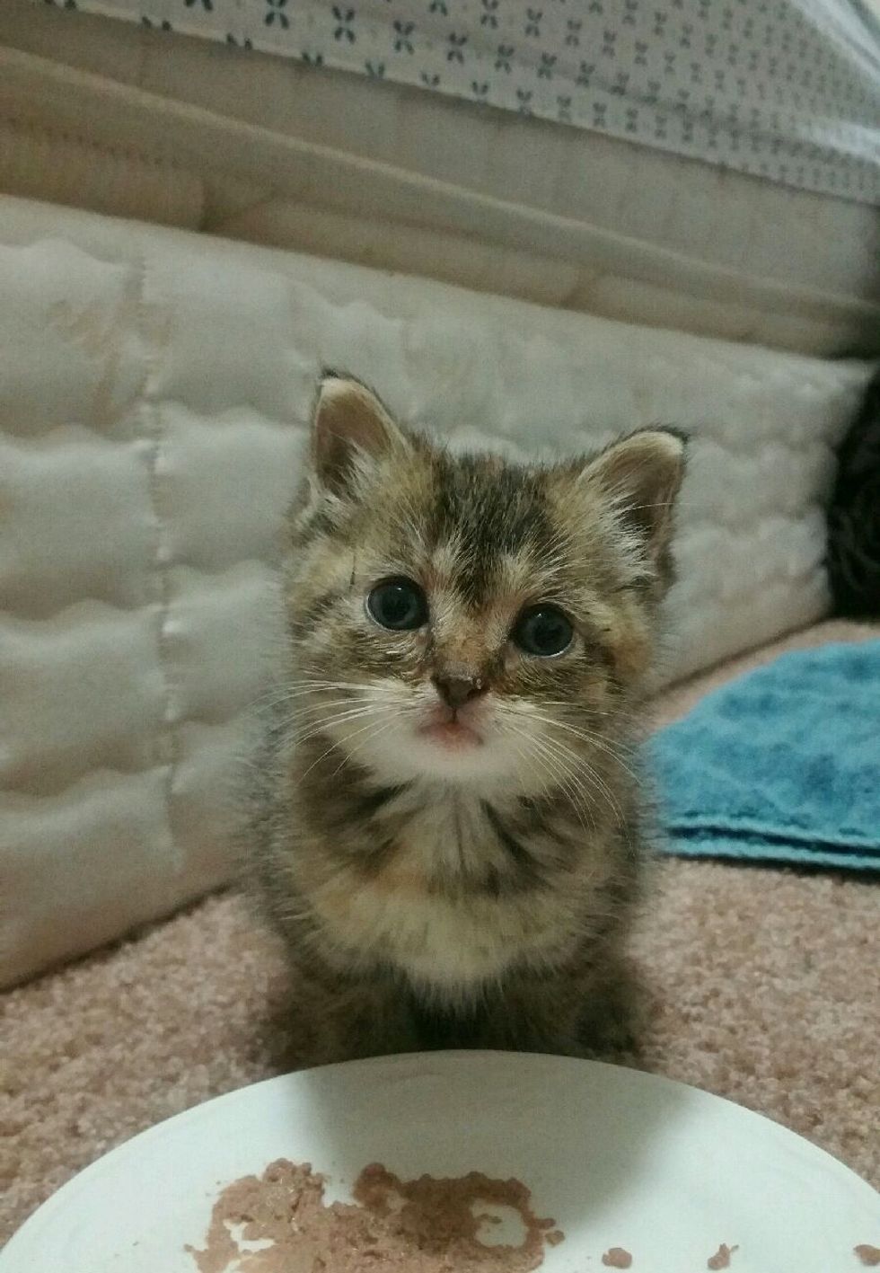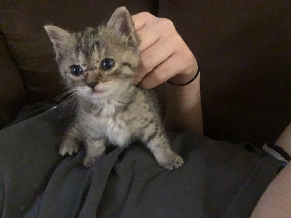 One morning Mike and his girlfriend heard the loudest meows coming from outside their house. Upon investigation, they found the tiniest little tabby kitten with the loudest set of lungs.