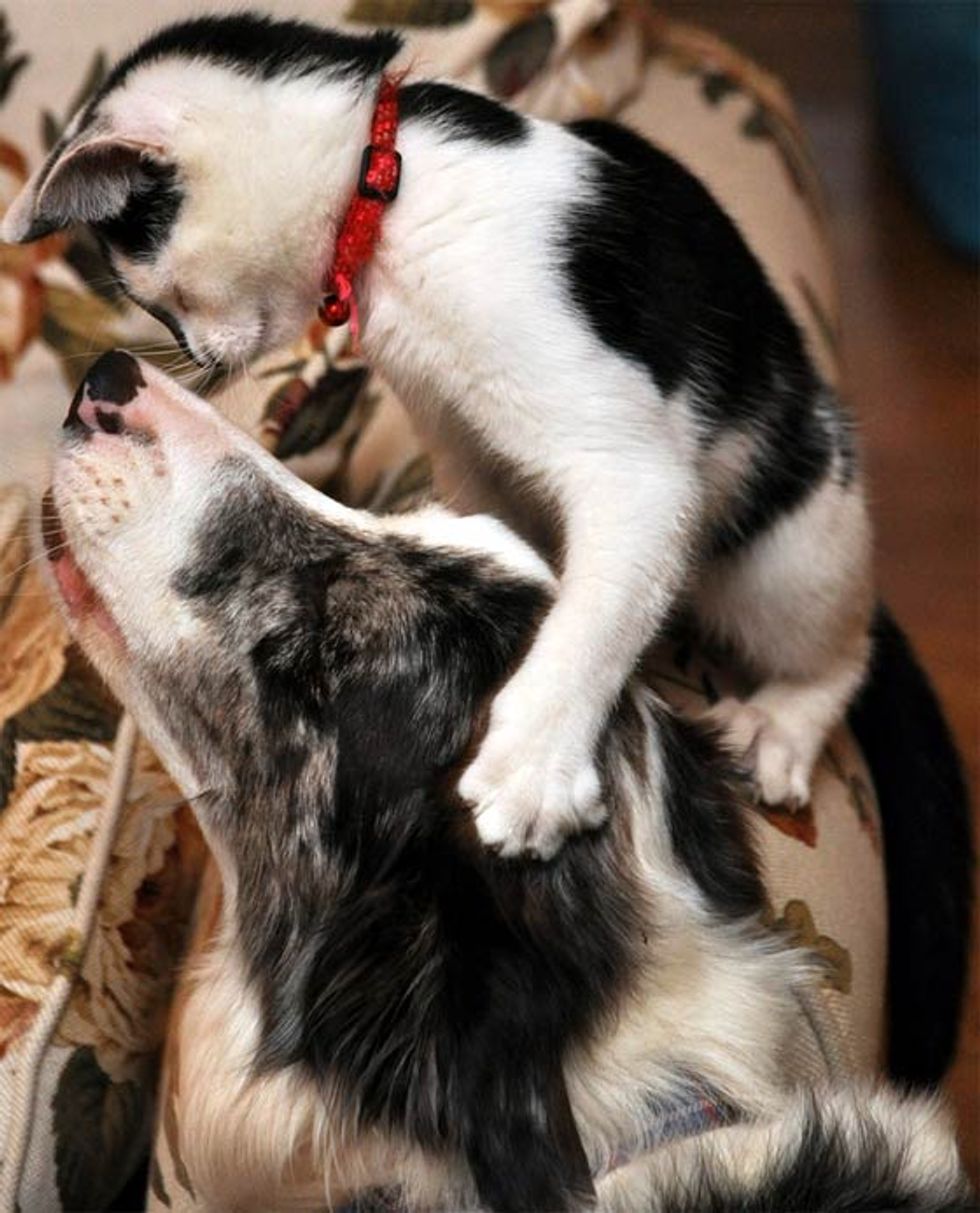 Mac the cow kitty fell in love with Gorby, a very loving and patient dog, on the day he moved into his forever home. They have been best friends ever since.