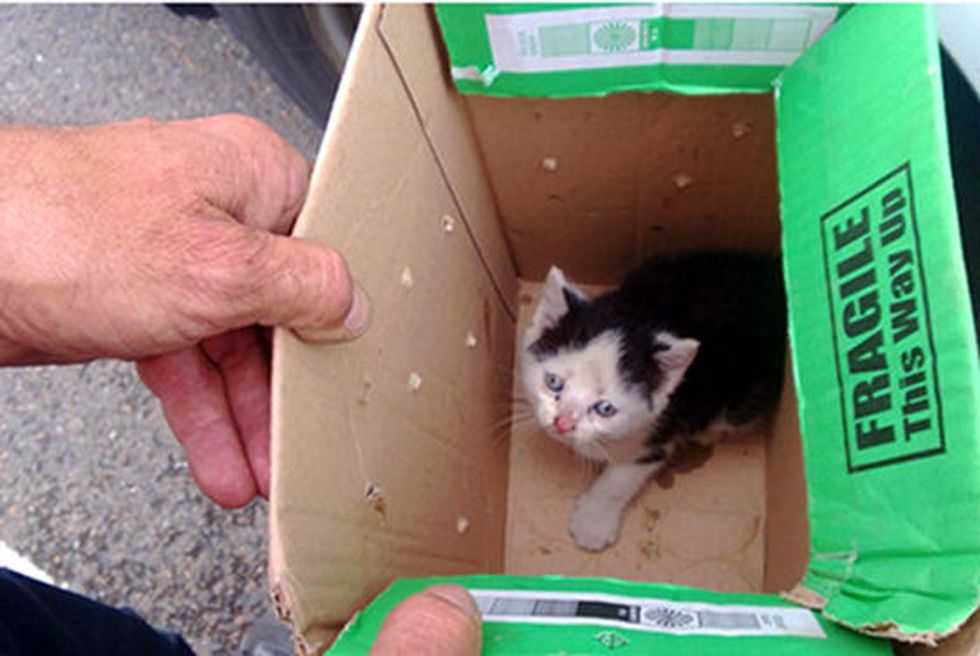 The kitten was very weak and barely hanging in when they pulled him out after surviving the unthinkable ordeal.