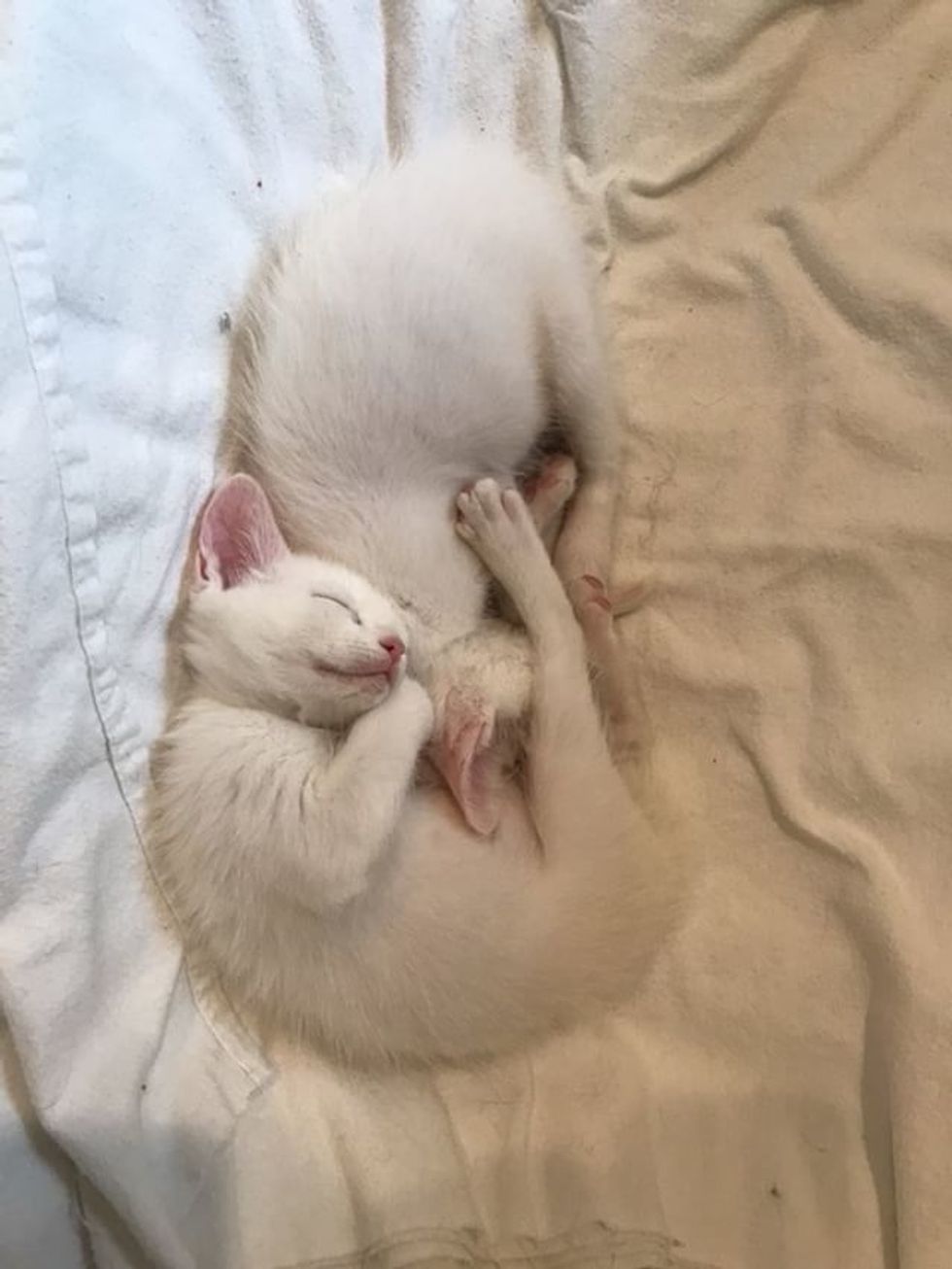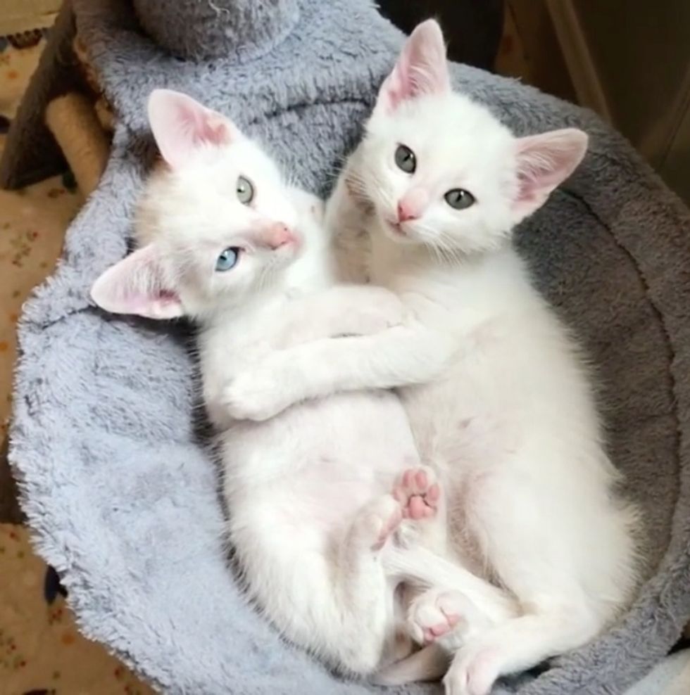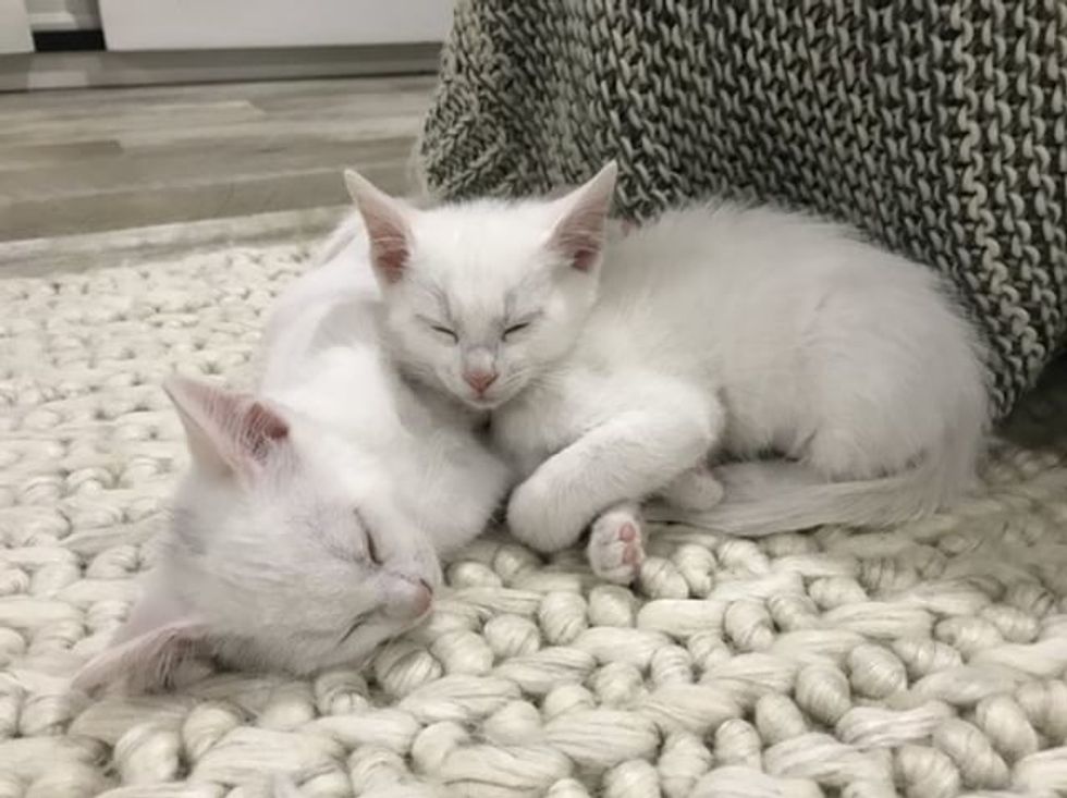 The sweet deaf kittens snuggled up together, dreaming about a place to call their own.