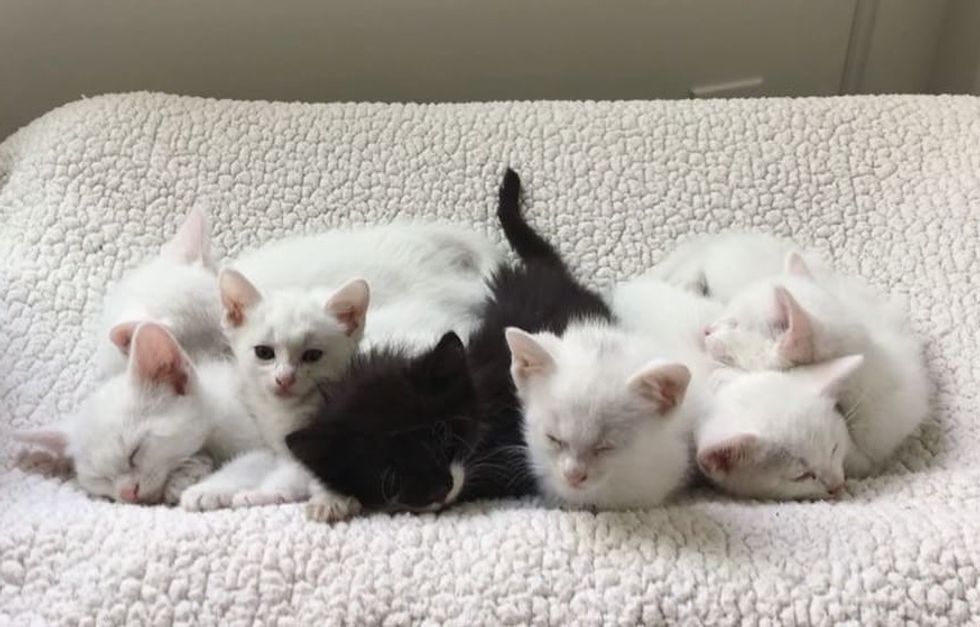 A cat who was found as a stray, gave birth to seven little kittens on Valentine's Day. Six of them were white and one was a tuxedo.