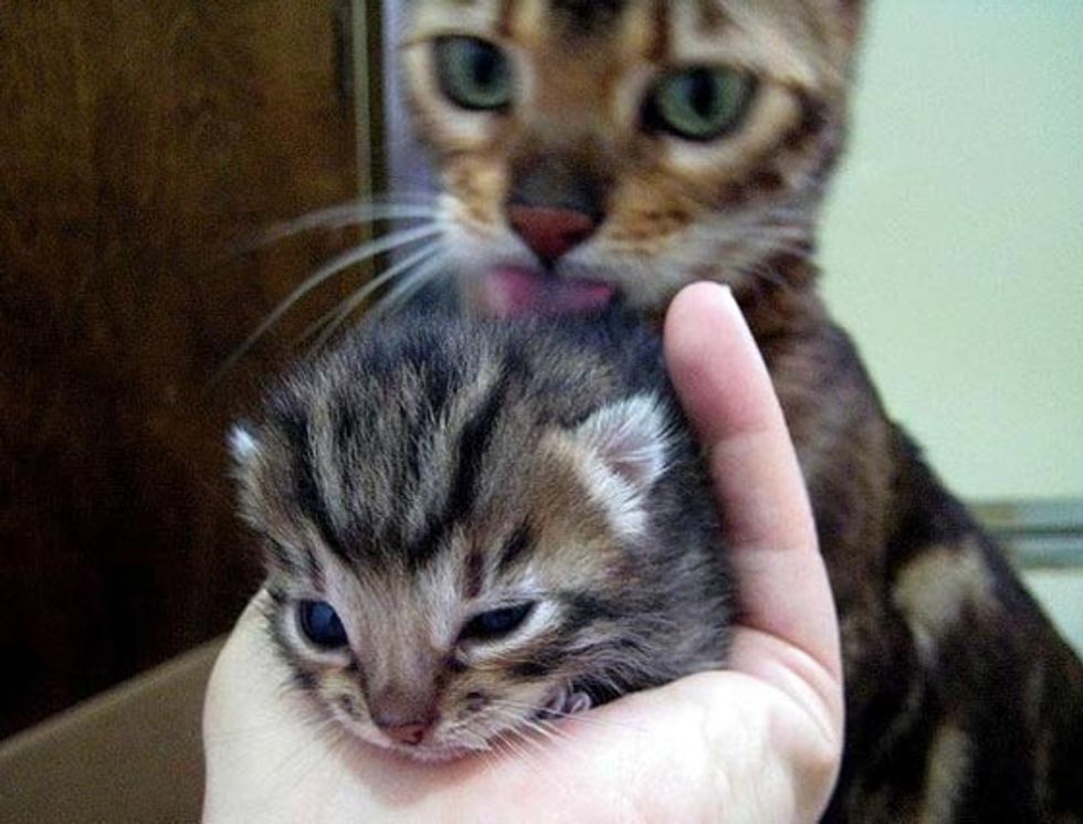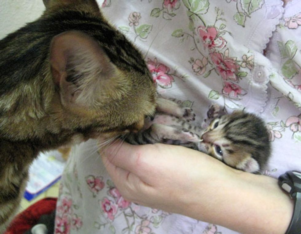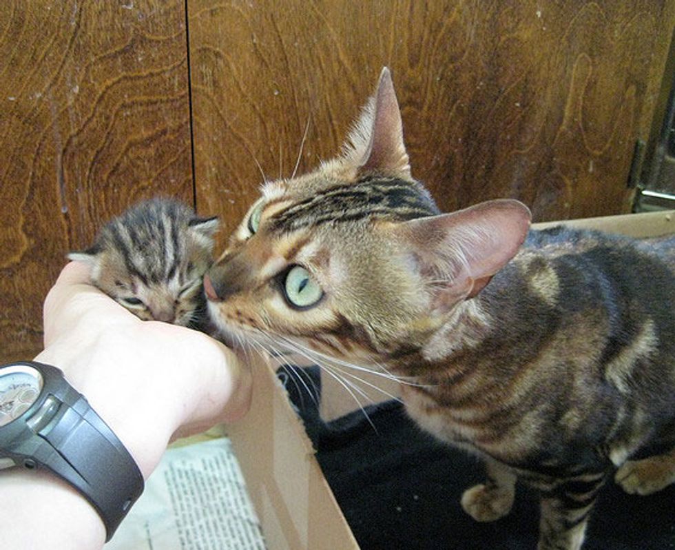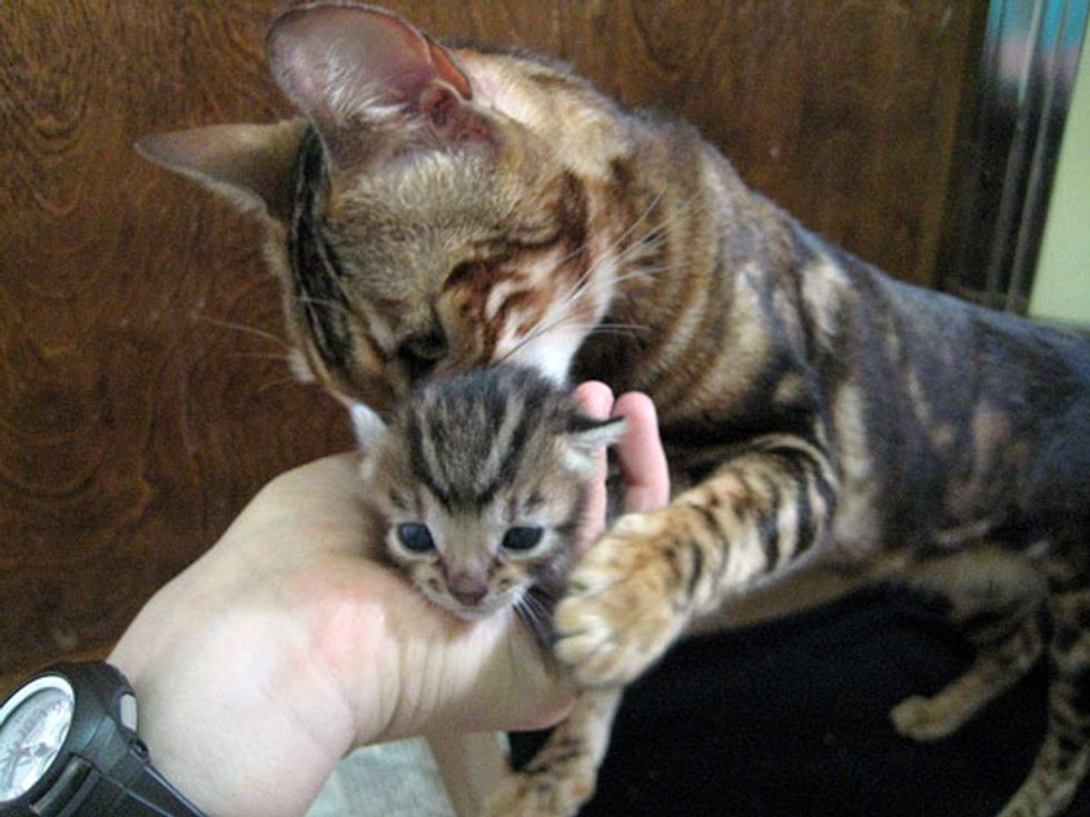 Zoraline and Ziggy were rescued by Kimberly J. from a shelter that had run out of room for the mother and son. The Bengal cat mama let Kimberly help her nurse her baby since she was short on milk. She groomed and cleaned little Ziggy after every meal. The love and devotion of a cat mama are truly amazing.