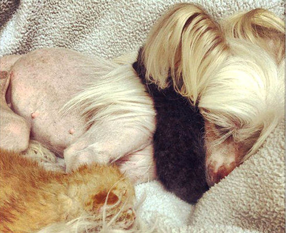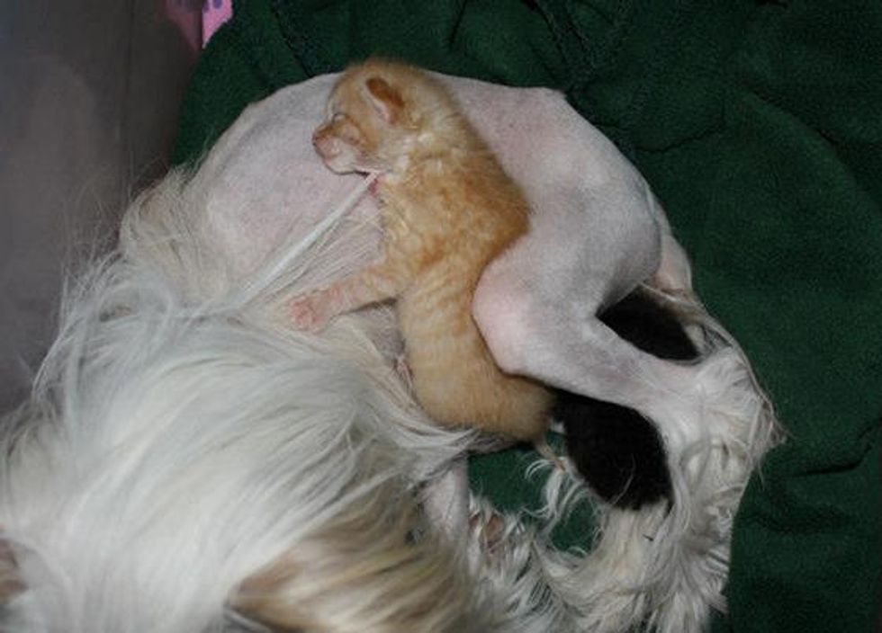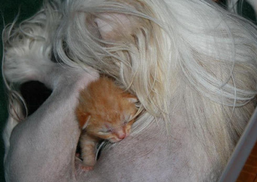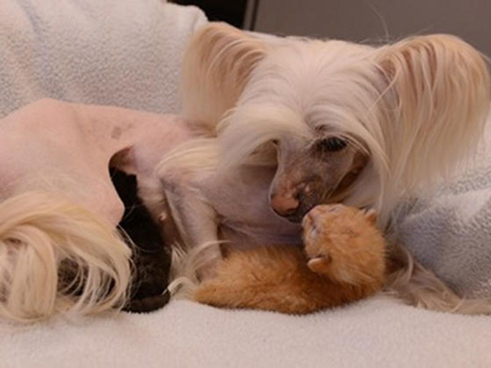 "The five-year-old Chinese Crested has 'adopted' two young, stray kittens that were abandoned by their mother and brought to the Burlington Humane Society."