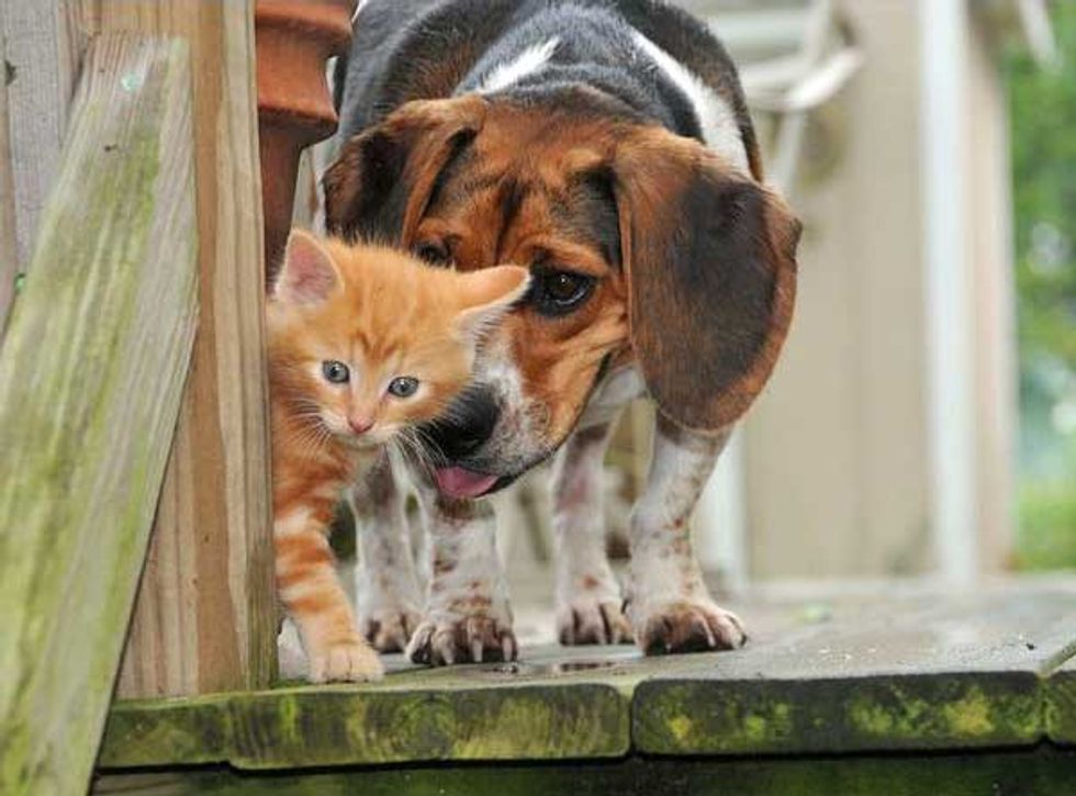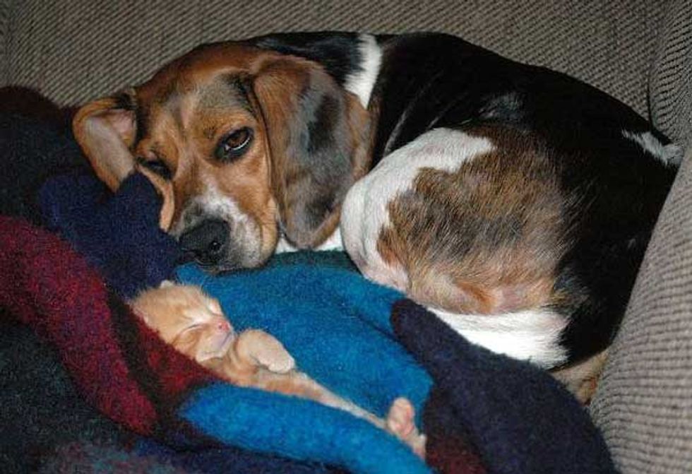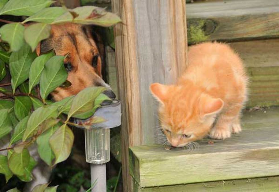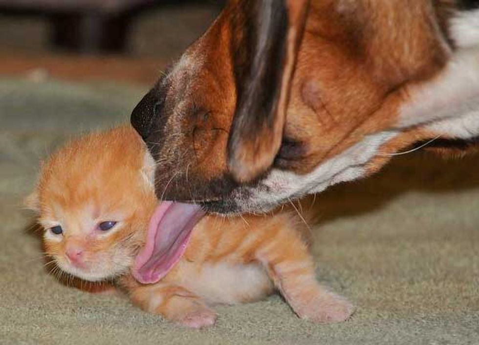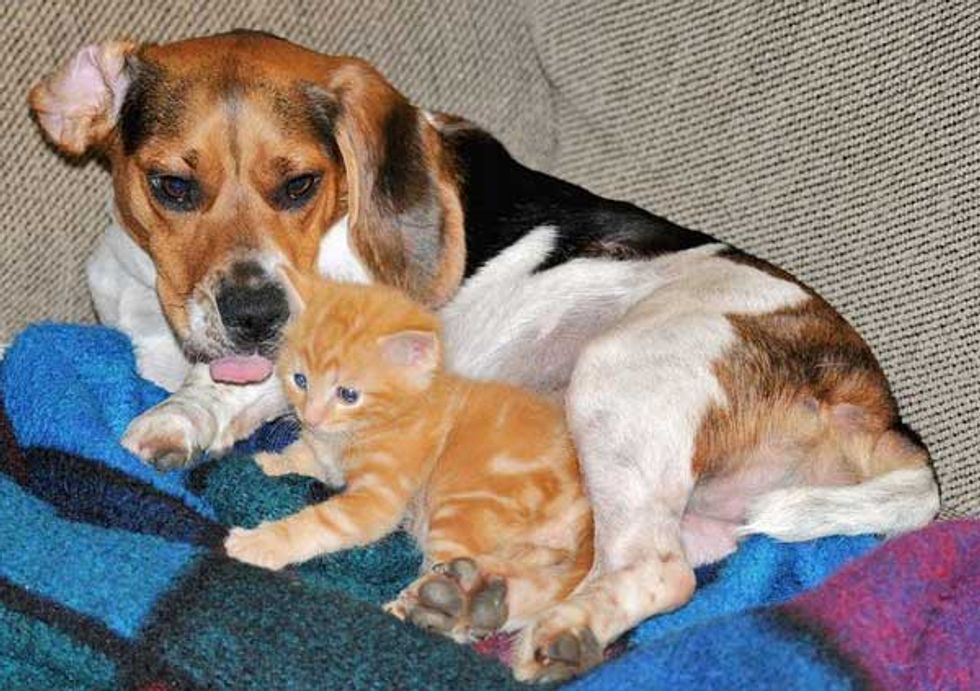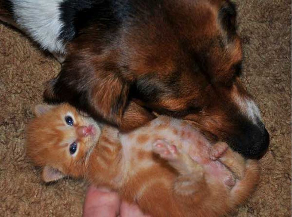 A little ginger bundle of joy found Terry on his porch one day when he was only a few days old. Terry later introduced him to Molly the dog who took to the little fuzzball right away. Her motherly instinct kicked in and started grooming the little bitty boy. Remarkably, the kitten turned to Molly's belly and began to nurse. It was the moment when the two knew that they are meant to be together for life.