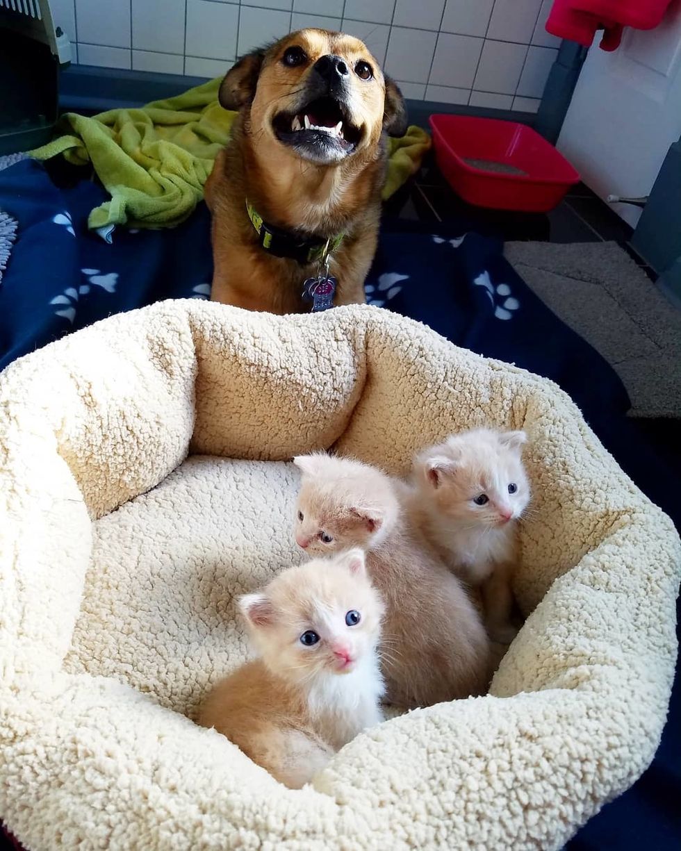 Turbo loves to hang out with the feline babies, and the kittens can't get enough of his presence.