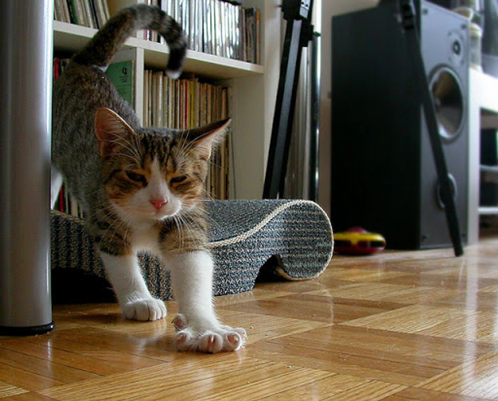His favourite toy is a wire with a tinfoil ball attached to the end of it. He drags it around with him and often 'presents' it to me in bed at 4am. His current favourite spot to hang out (it switches) is on the top shelf on my coat closet. He'll sometimes swipe at me from above when I come home and don't acknowledge him (mostly because I don't see him up there).