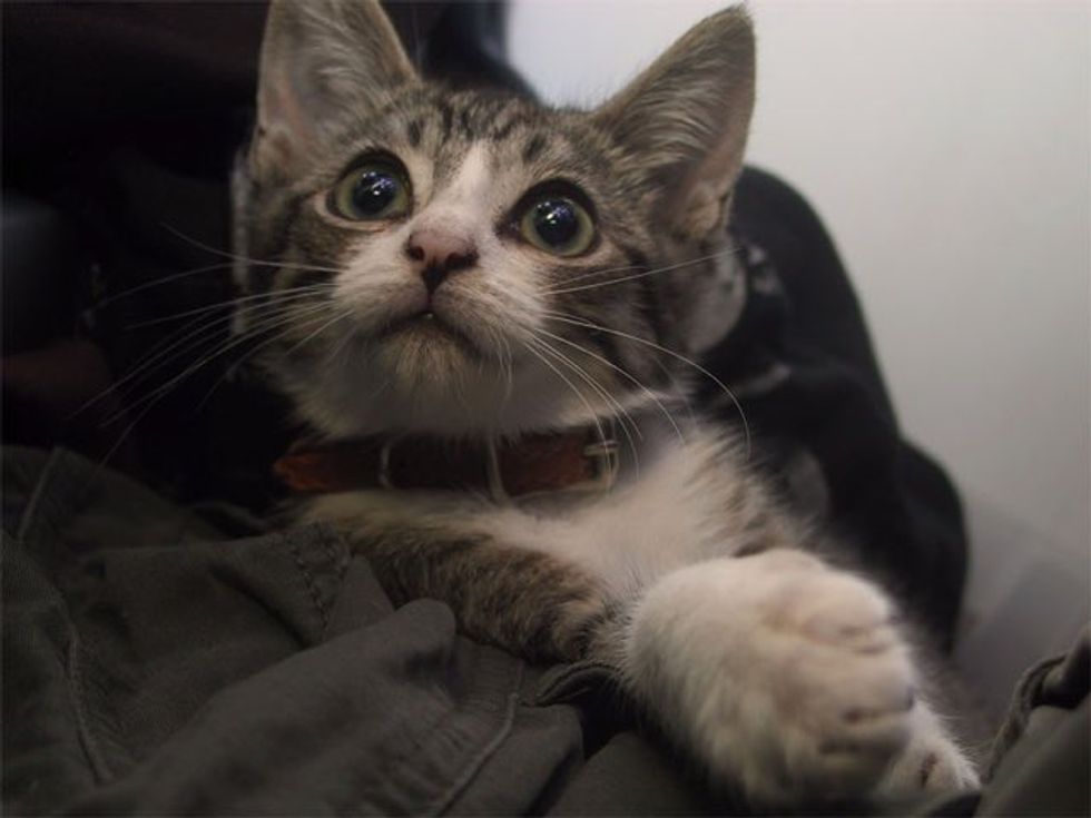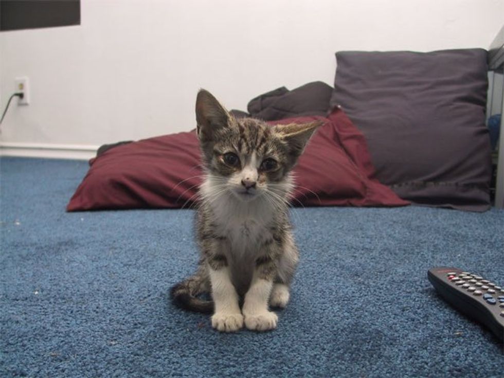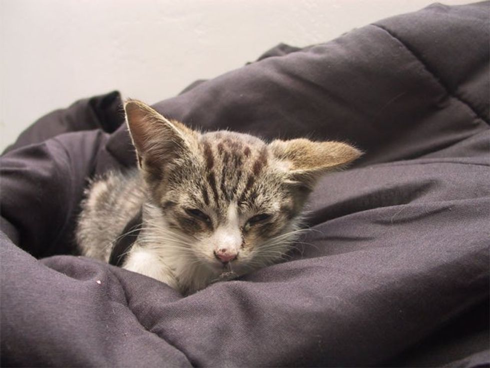"Roommate found him outside our door. He meowed once but was silent after that. He could fit in the palm of my hand, and was so light I couldn't feel any weight. He was in bad shape." (reddit)