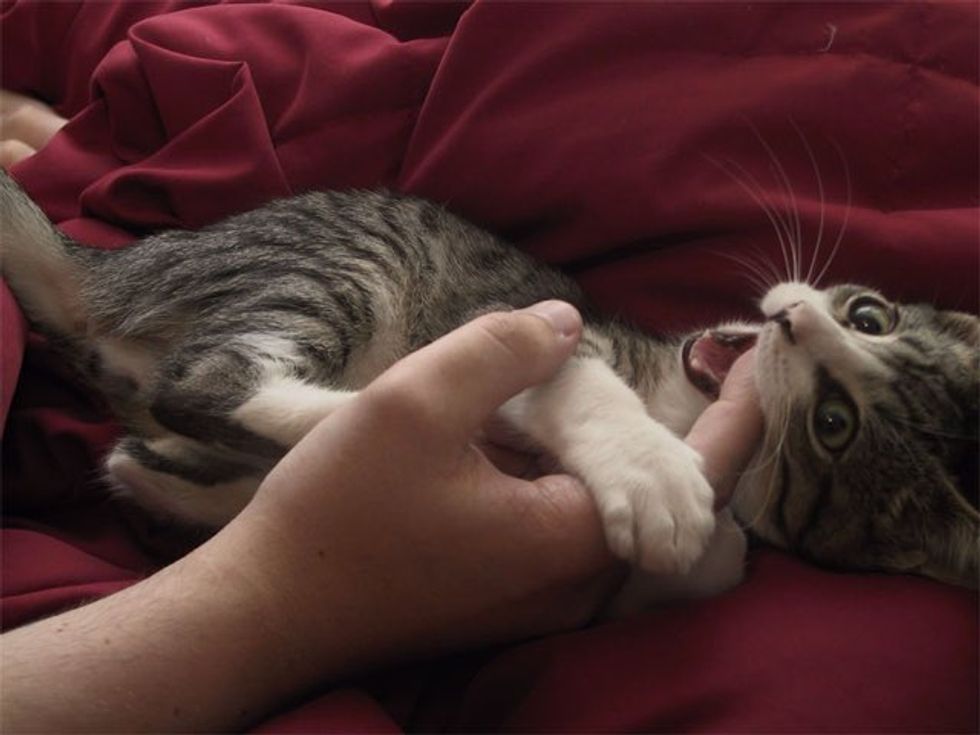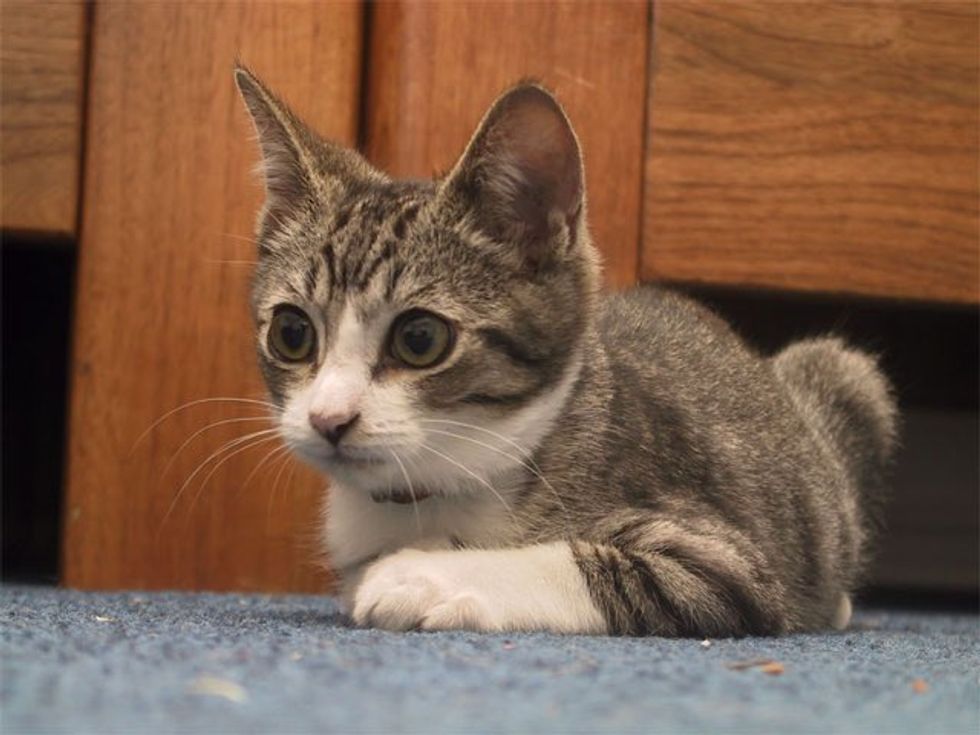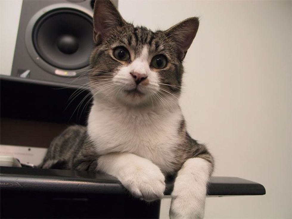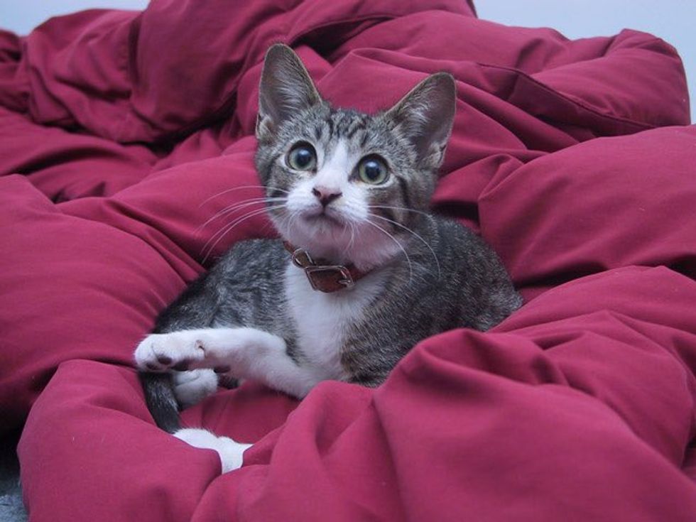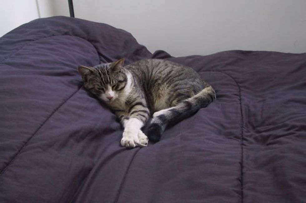 Meet Edward! He was just a little kitten when they found him outside their apartment door back in 2004. "An abandoned kitten found me, and my roommate and I nursed him back to health," imgur user vogelfm wrote.
