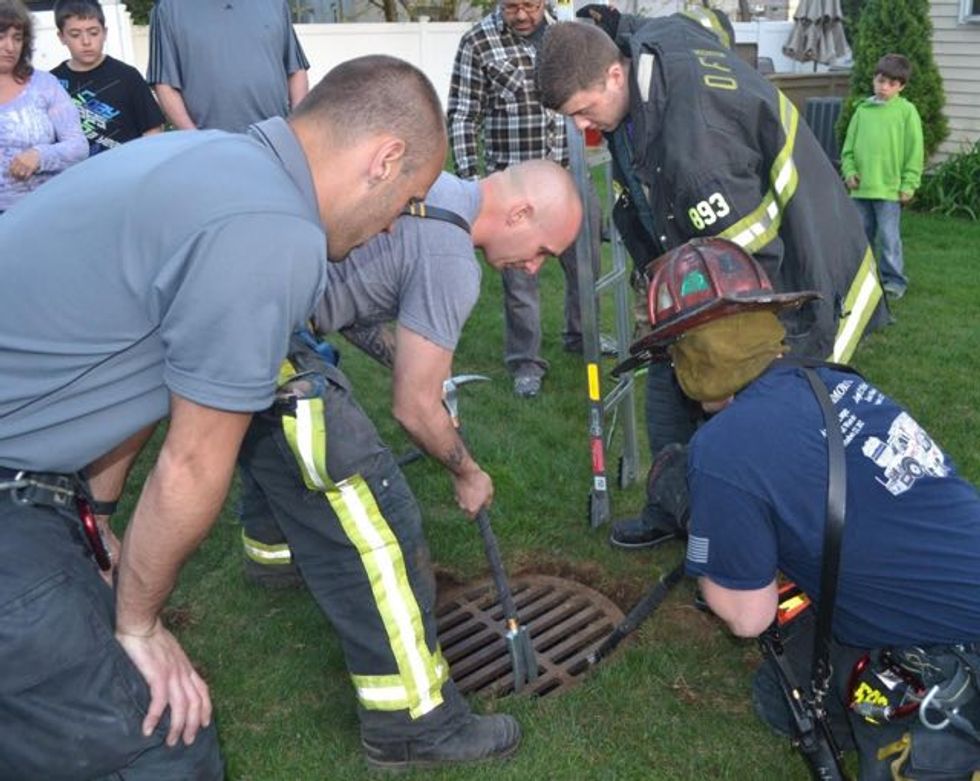 About a dozen of men came to the scene. After they made sure the air was safe in the well, a young firefighter Danny Leboff descended into the narrow well, and Roscoe was brought back above ground, couldn’t wait to get out.