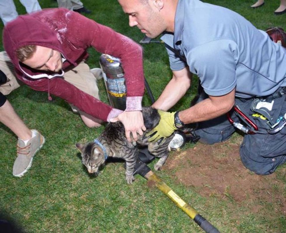 A dozen of firefighters helped rescue Roscoe the cat and brought him to safety.