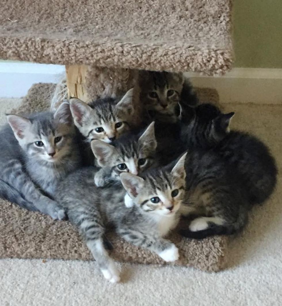 Baby seven is happily reunited with siblings. They all have similar markings and colors.
