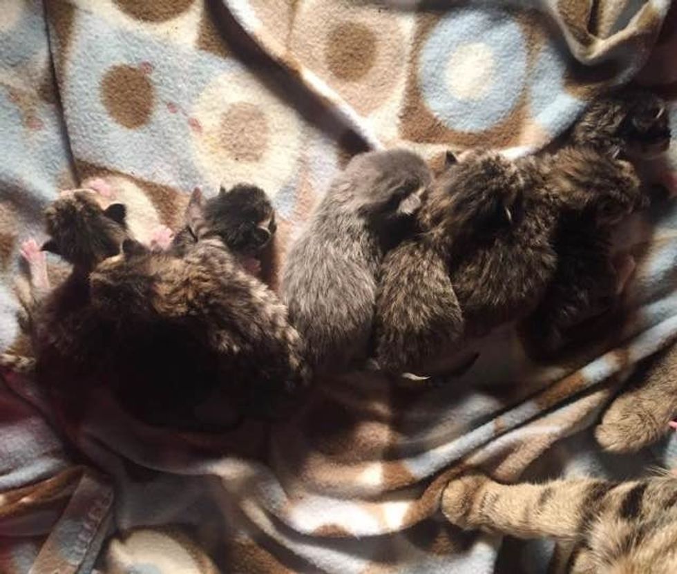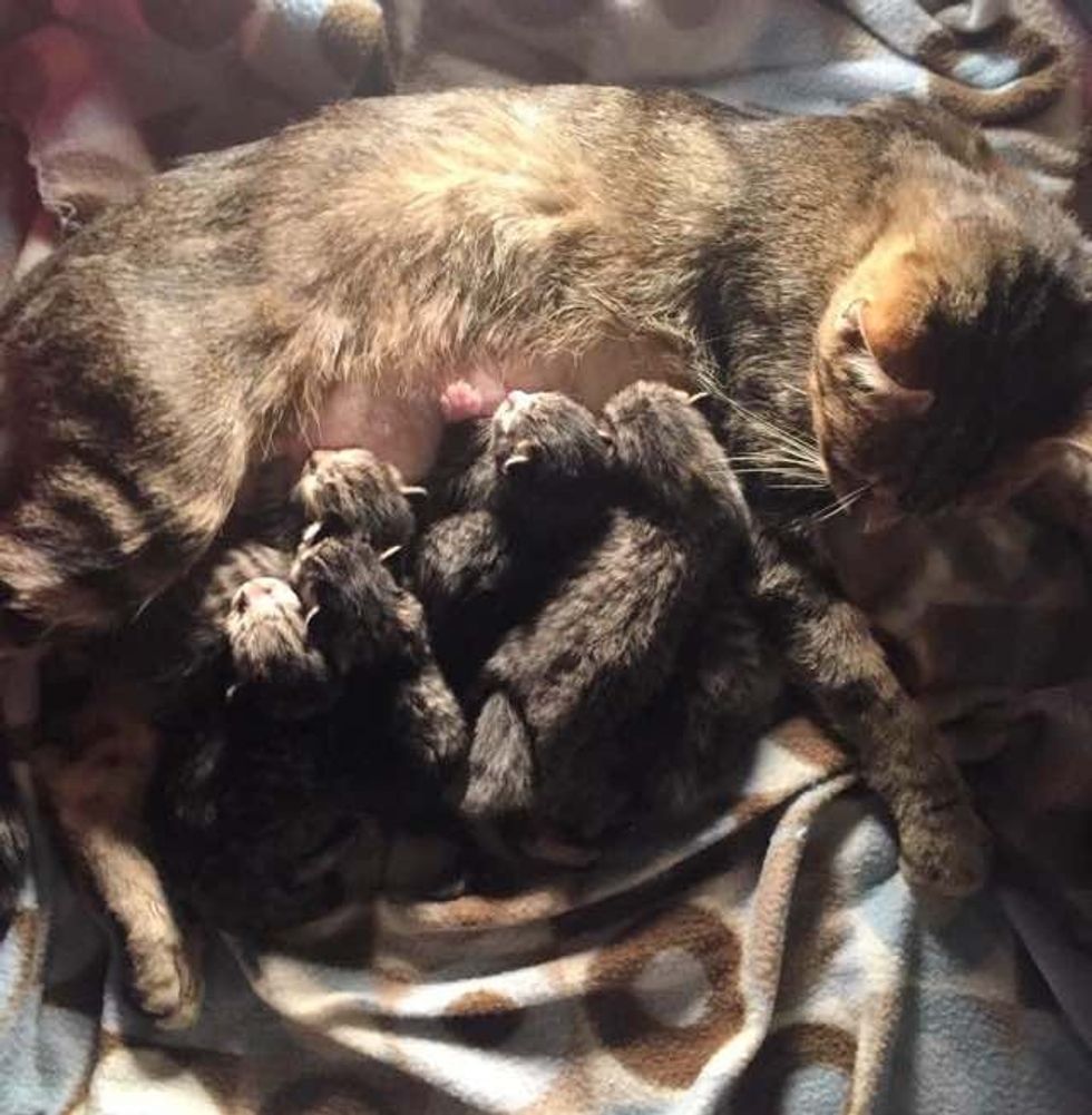 Mama and her kittens are doing great! Feeding seven very hungry babies is no easy work.