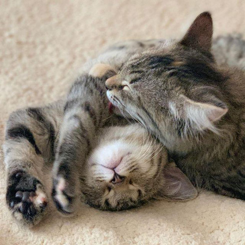 "When they would finally take a break, they loved to cuddle up together on my bed or on one of their Meow Parlour beds. They could often be found giving one another baths, which sometimes turned back into wrestling."