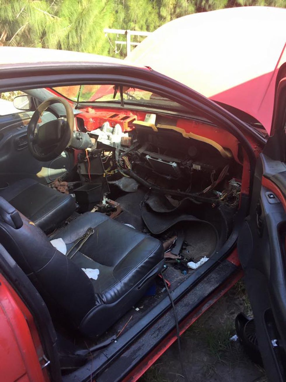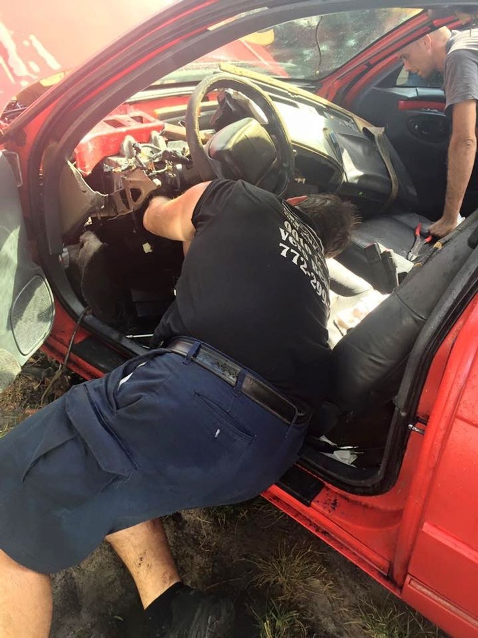 After some cutting and carefully prying apart the metal parts, they got the little feline out to safety. "Removing the dashboard wasn't too difficult but cutting through the firewall without injuring the cat was," Spada said.