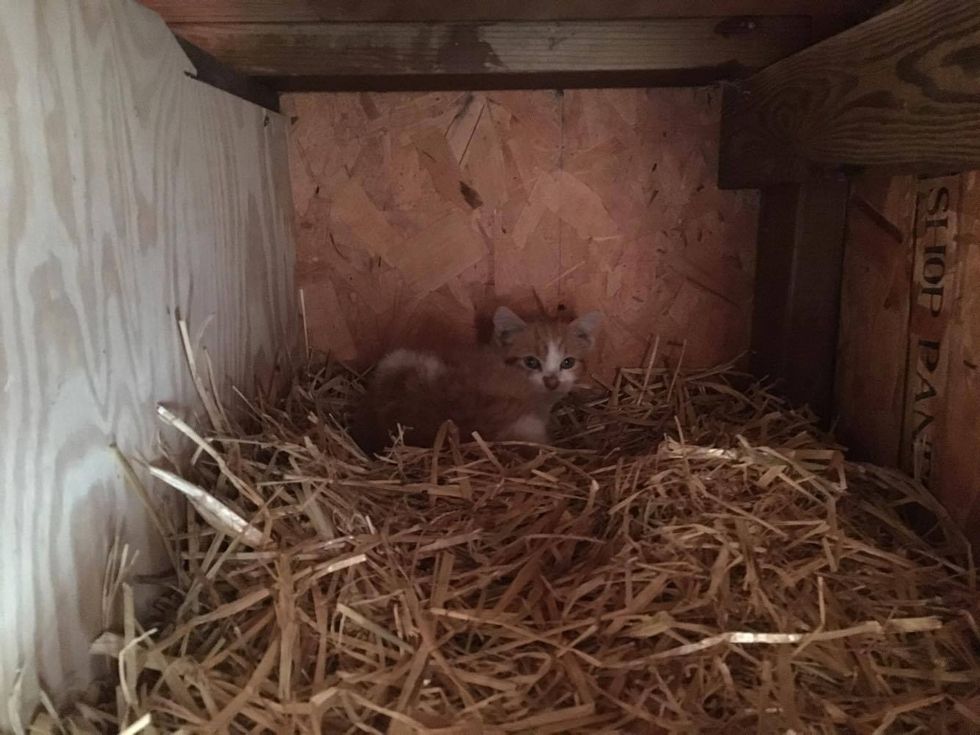 A tiny ginger kitten wandered into a chicken coop and started snuggling with his feathery friends who kept him warm.