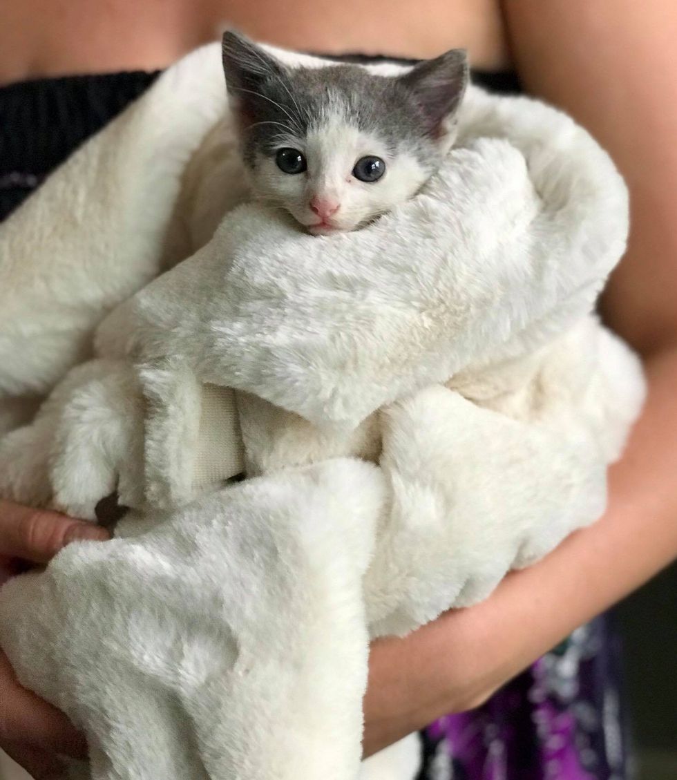 The sweet kitty felt snug and comfortable, cuddling with her rescuer.