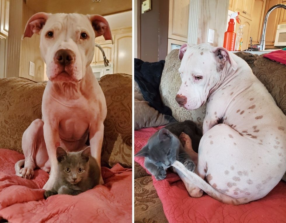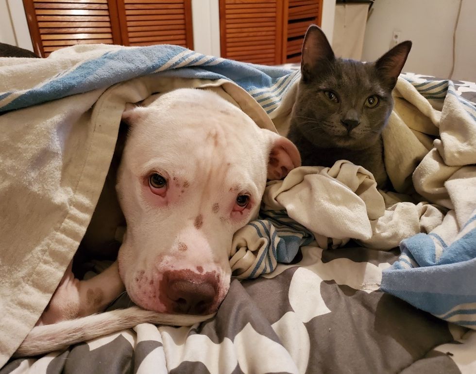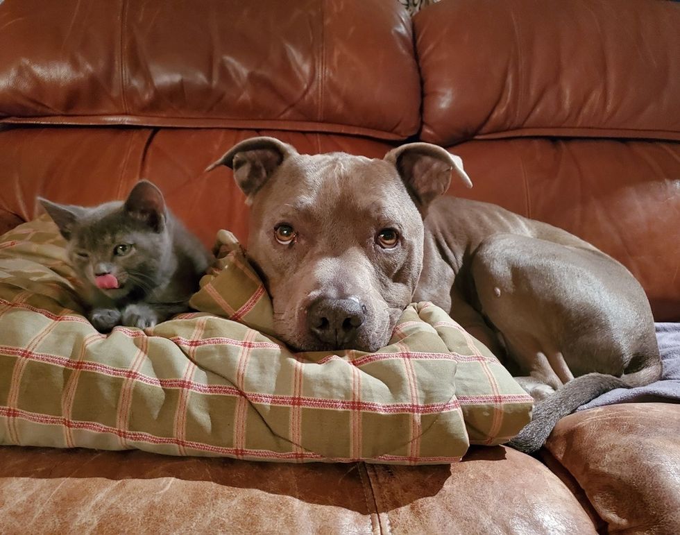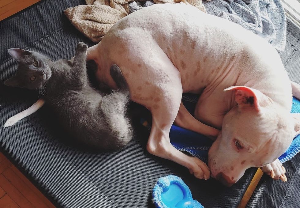 Gunner, the sweet 7-year-old canine, was so happy to share a blanket with this little feline buddy.