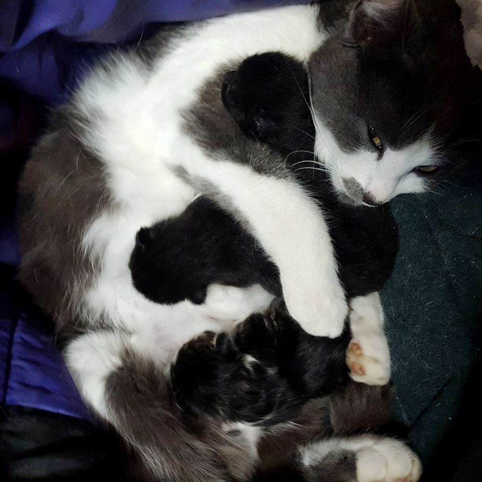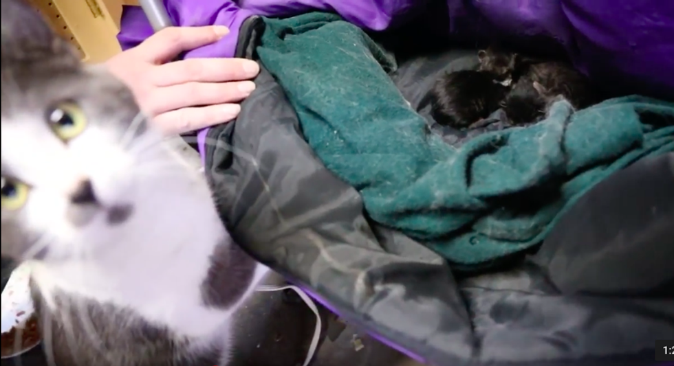 Upon investigation, they found not just one but a litter of three kittens along with their nursing mama, nestling comfortably in an old sleeping bag.