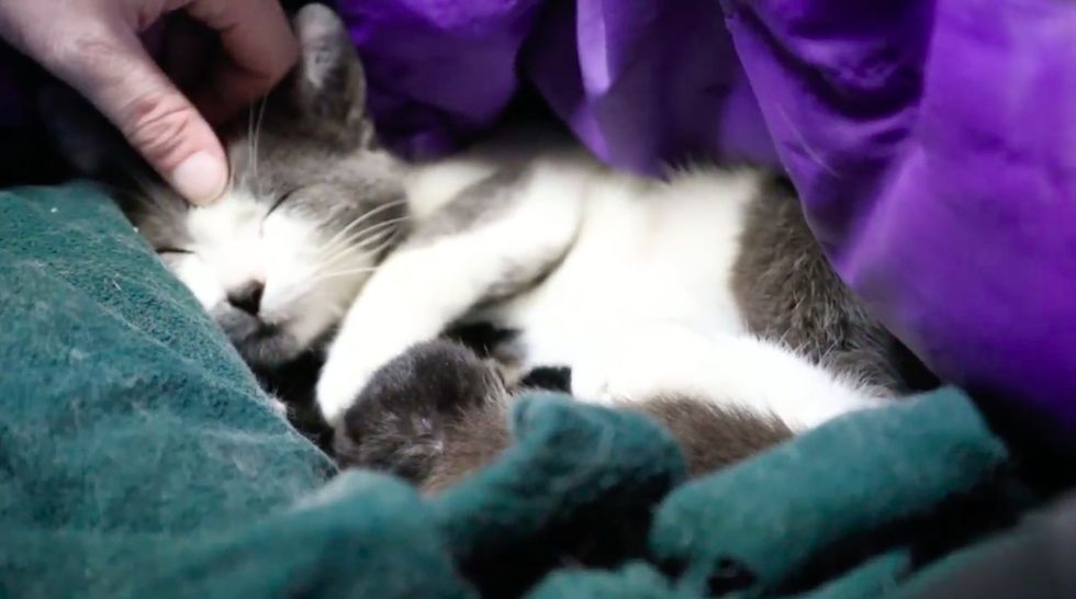 Mama Lil' Grey is doing a wonderful job caring and nursing her babies. She's so happy to have a warm and safe place and all the belly rubs.