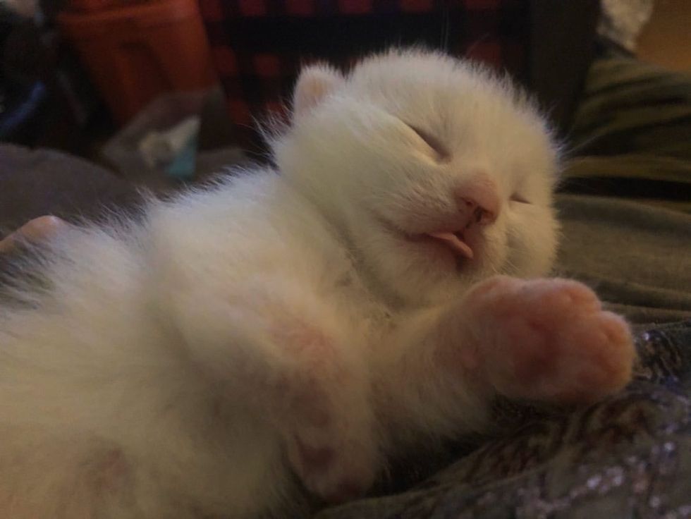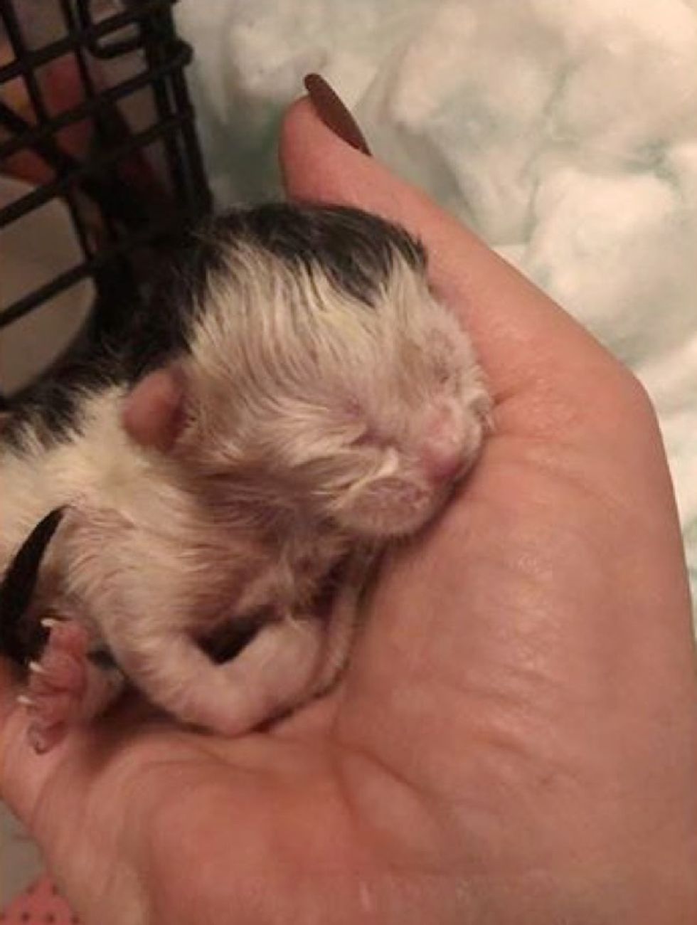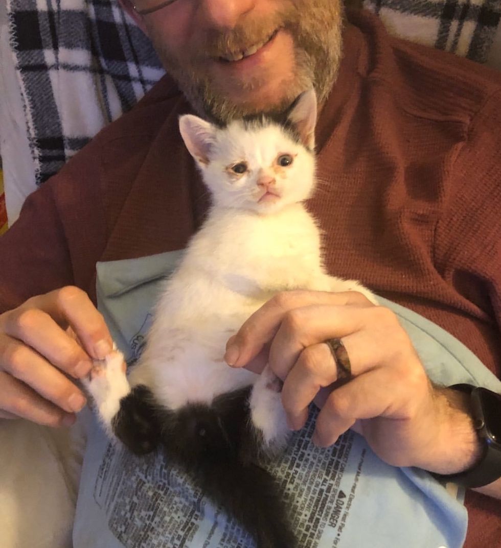 On October 24th, she gave birth to two kittens, but only one survived. The little singleton was born with one bent arm. They named him Lux and the cat mom Kat.