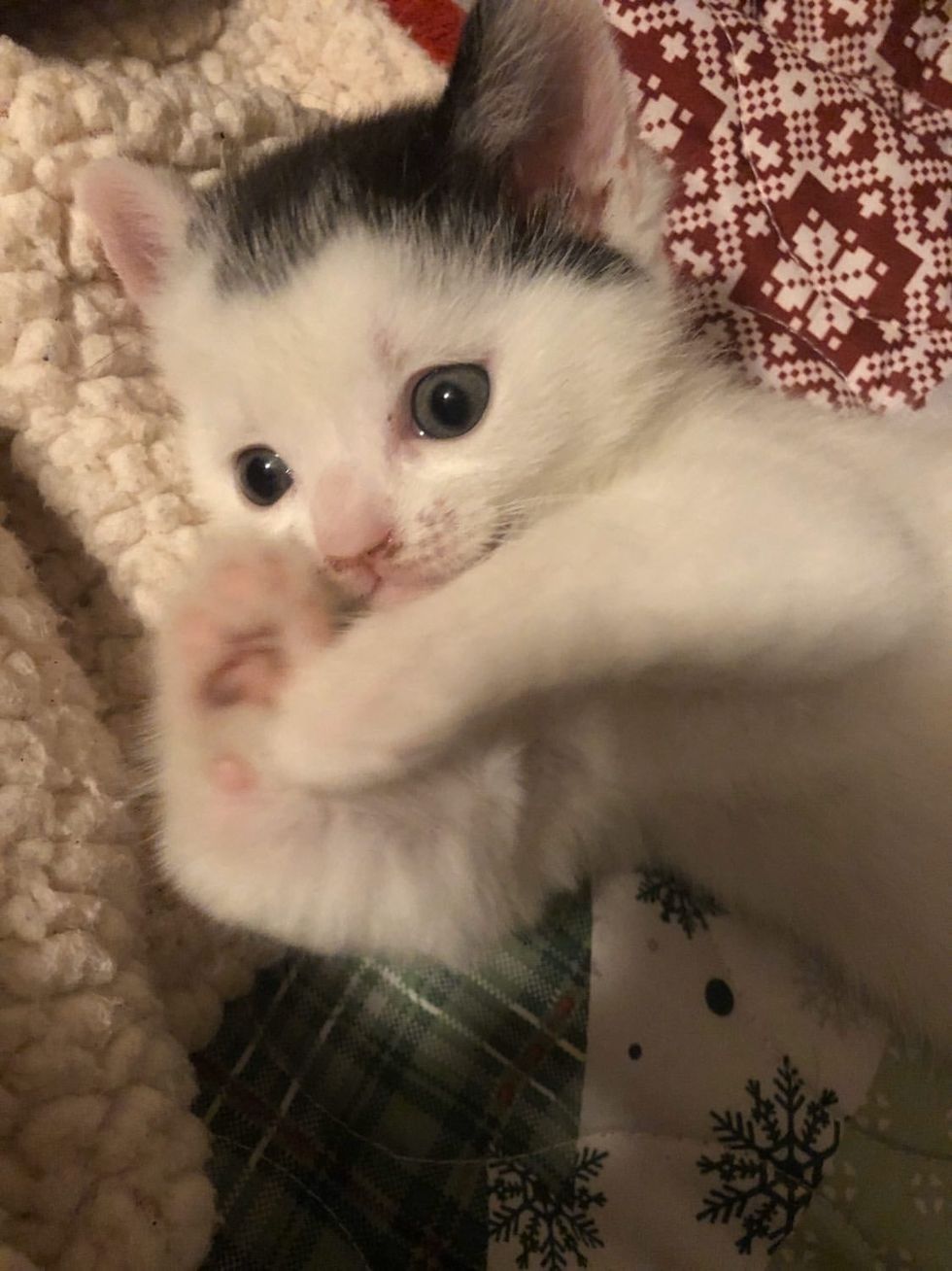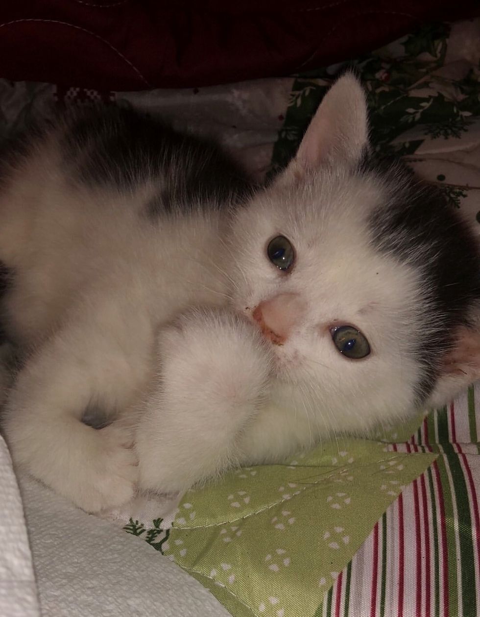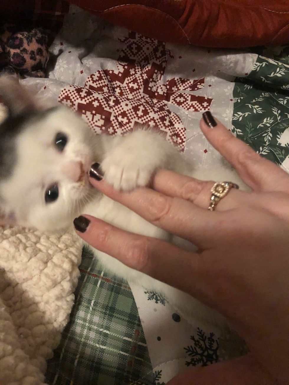 Mama Kat was a bit shy and easily startled but she was so glad to have a roof of her head and a quiet place to raise her baby. "At first, I didn't notice his bent paw until I went over and held him for the first time," Pamela said.