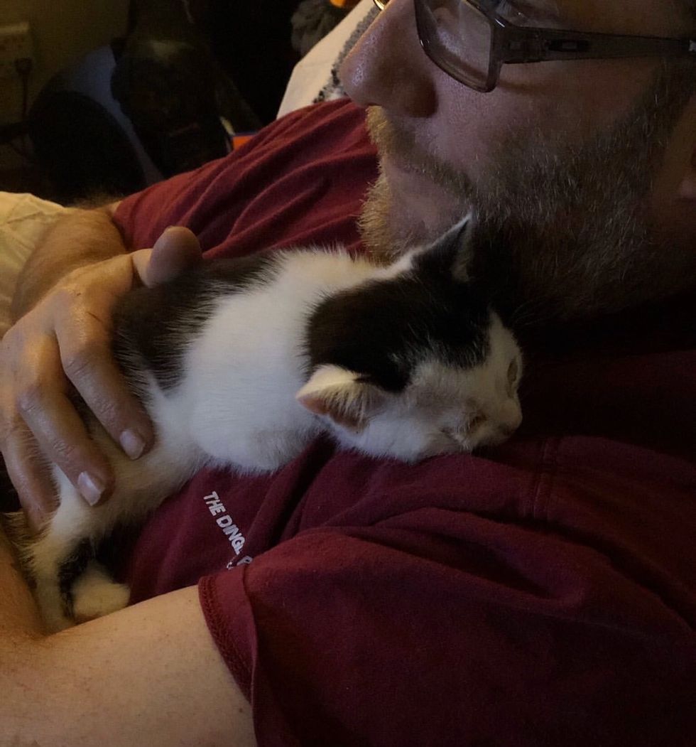 When he is not running, catching invisible bugs, he's cuddling up to his humans, falling asleep on their shoulders or lap.