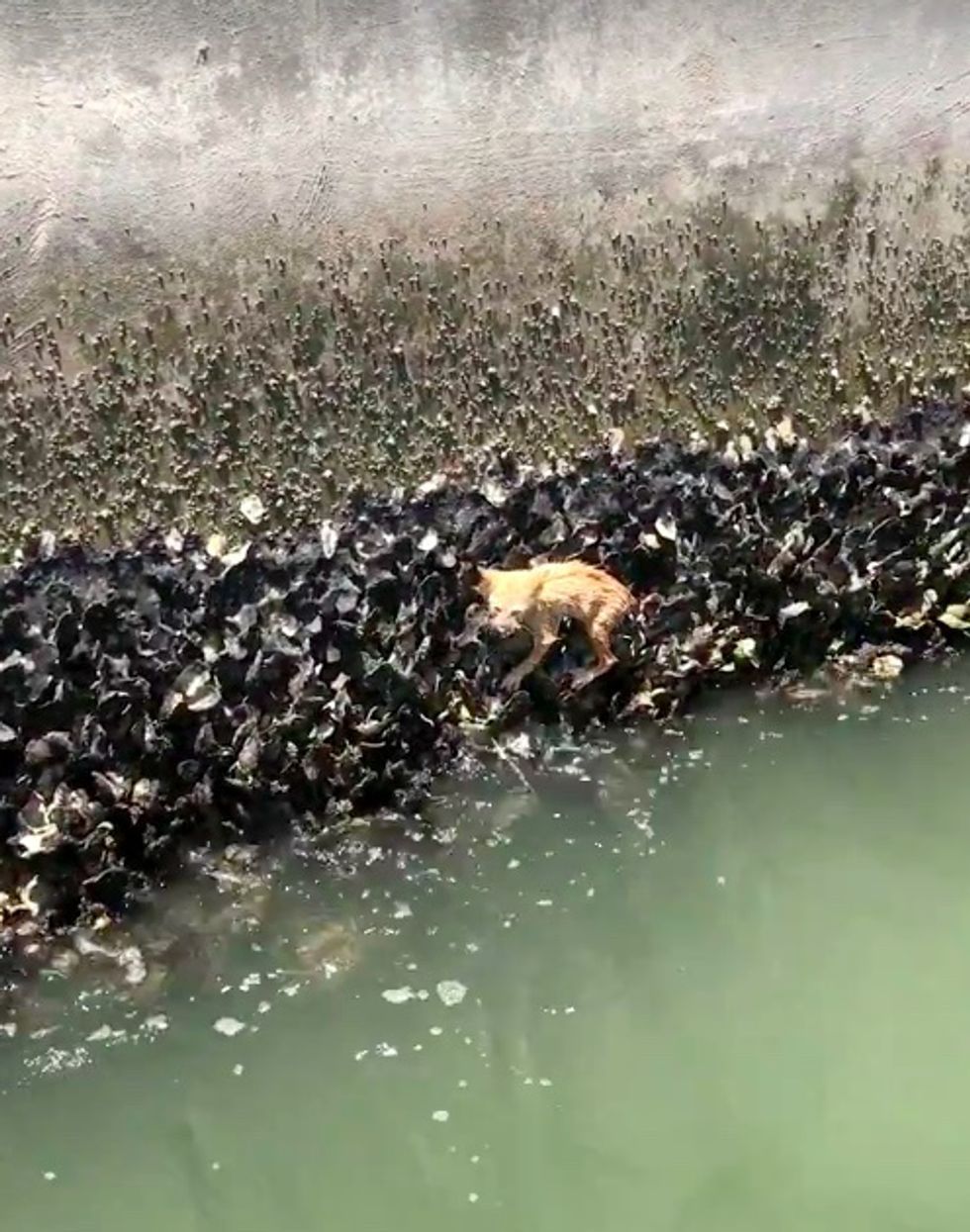 As Robert Gecy and his family brought their boat closer to the bridge, they were shocked to find a little ginger kitten who had taken refuge on the oyster pilings, hanging tight with his claws as the tide pushed up against him.