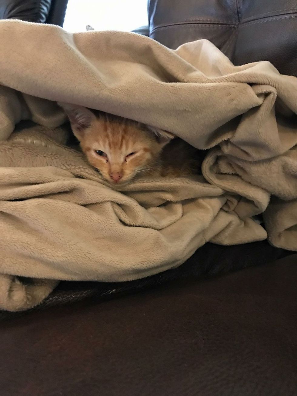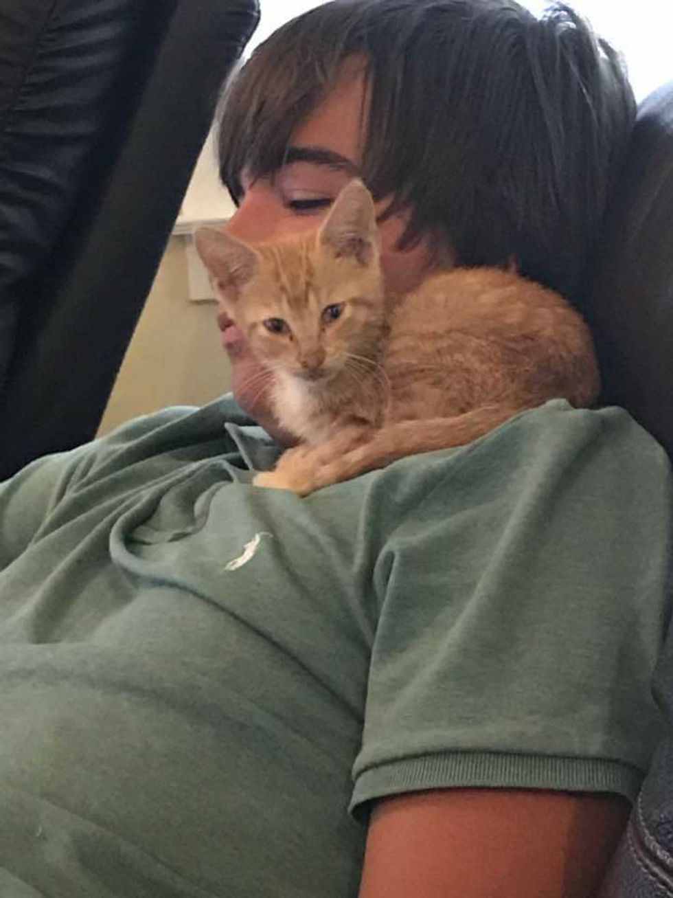 After a much-needed bath, plenty of food and water, the kitten snuggled up to his humans for some TLC.