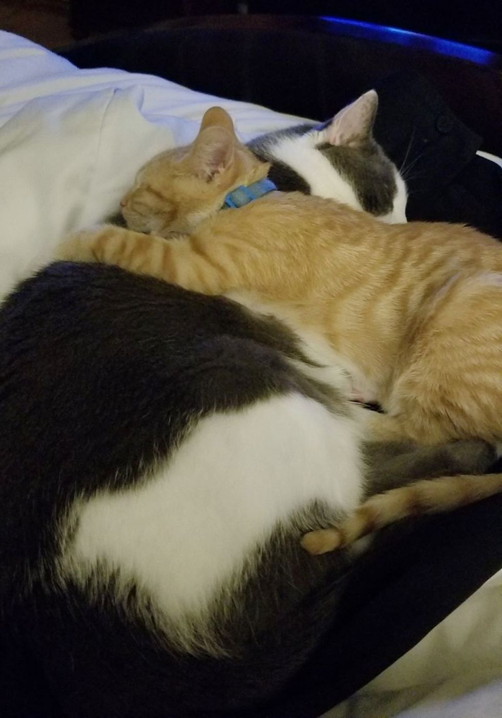 The little ginger boy has found his favorite napping spot. "He looked up at my son who was sitting cross-legged on the floor next to him, and crawled up in his lap," Robert told Love Meow.