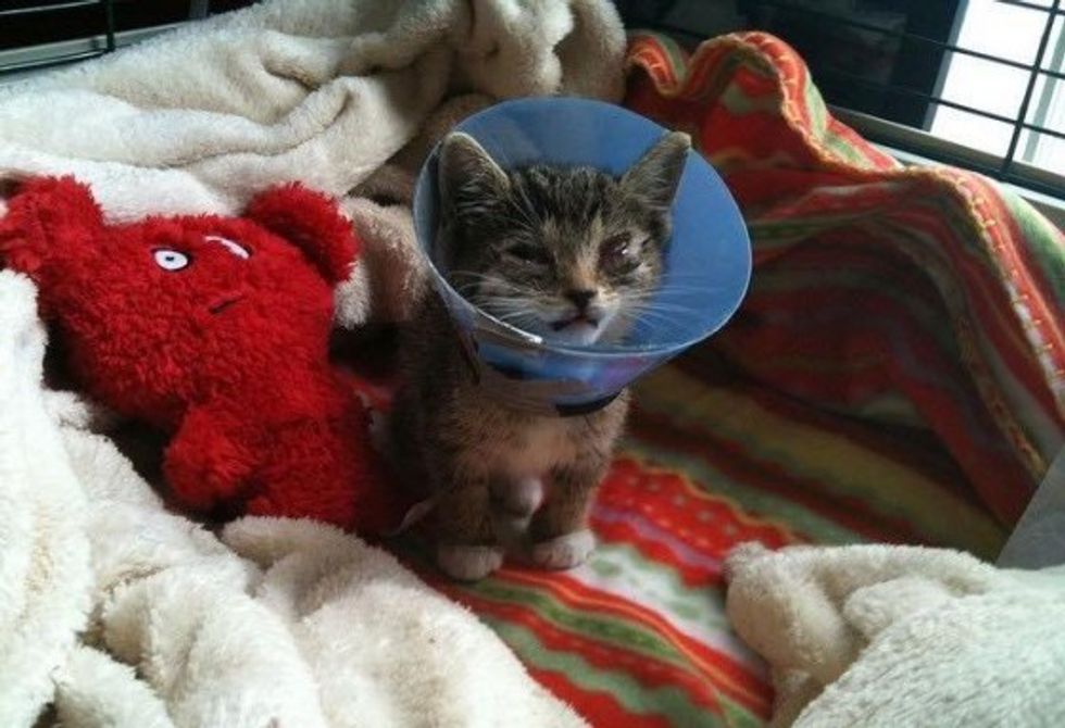 They cleaned up the kitten and made her a collar so she wouldn't rub her eyes. The kitten had to be fed with a syringe due to her severe upper respiratory infection, but she was happy to finally have people who could help her.